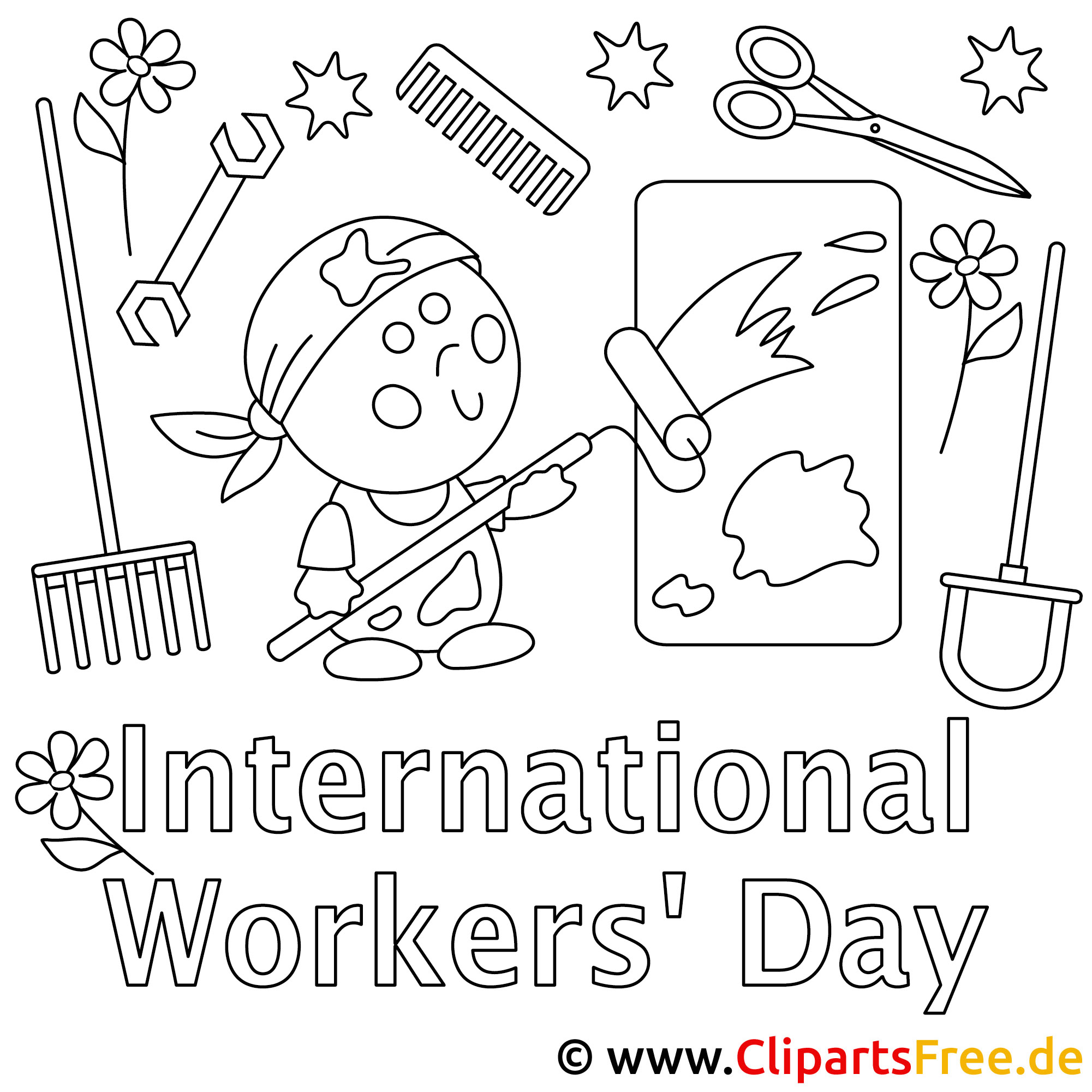 In dieser fröhlichen Ausmalvorlage sehen wir ein kindliches Wesen mit einer ganz besonderen Farbklecks-Mütze. Es hält einen Farbroller in der Hand. Ja genau, und schaut mal, da sind Pinsel, Schaufeln und Werkzeug um das Bild herum verteilt! Besonders hervorzuheben ist die tolle, bunte Gestaltung – man könnte schon fast sagen, es sprudelt vor kreativen Ideen. Unter dem fröhlichen Kind steht in großen Buchstaben „International Workers' Day“. sozusagen, Das ist ein Tag, der oft mit Arbeit und Anstrengung verbunden ist, aber hier wird alles mit etwas Spaß und Farbe dargestellt!