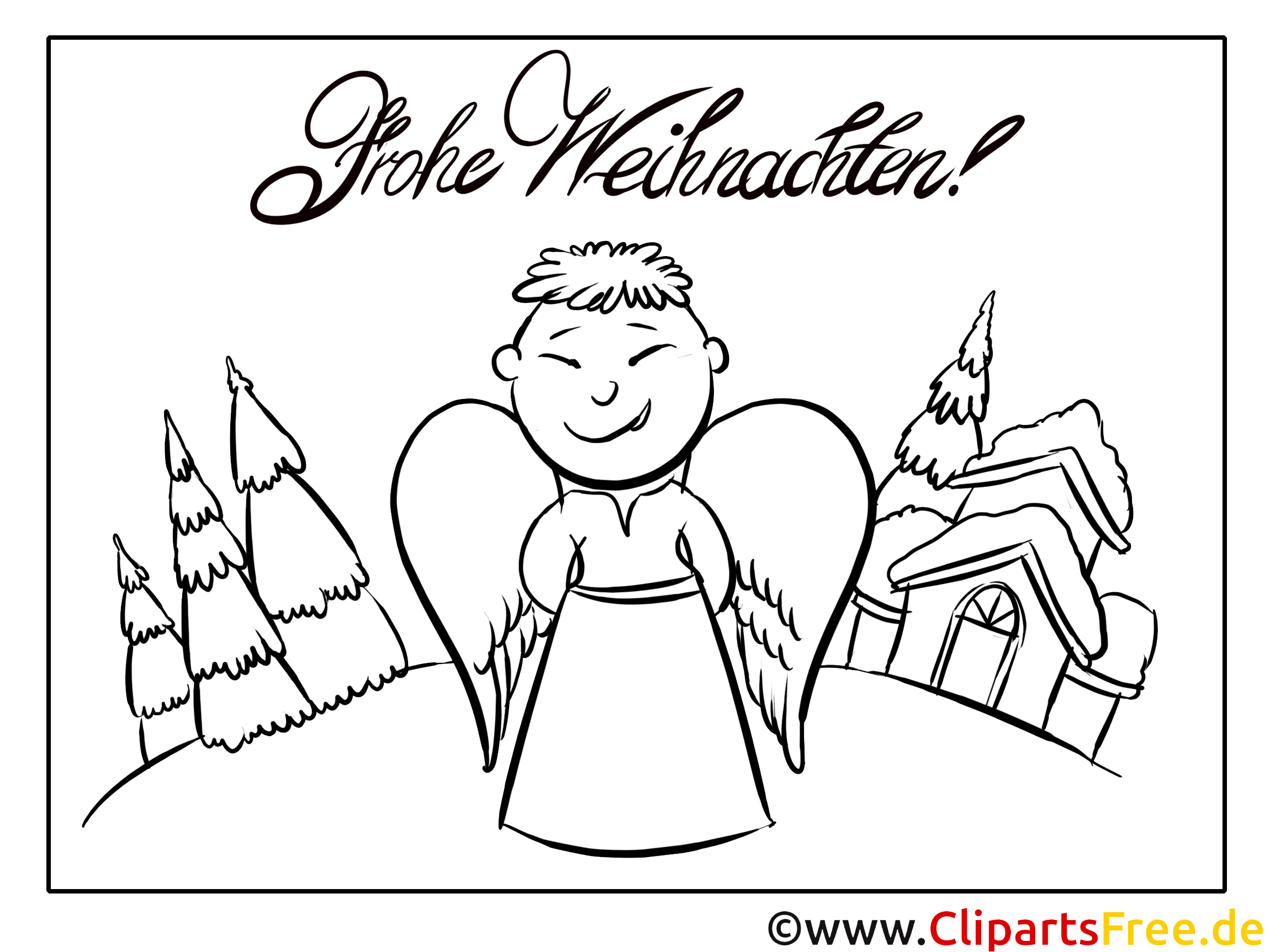 Das Bild zeigt einen fröhlichen Engel, der mit einem breiten Lächeln dasteht. Er hat große, sanfte Flügel, die um ihn herumleuchten. Der Hintergrund ist weihnachtlich gestaltet, mit verschneiten Bäumen und einem niedlichen kleinen Häuschen. Darüber prangt der Schriftzug „Frohe Weihnachten!“, der die ganze Szene wunderbar zusammenfasst. Auf eine einfache, doch charmante Weise verkörpert dieses Motiv die festliche Stimmung und Wärme, die zur Weihnachtszeit gehört. Die Linien sind klar und freundlich, besonders für Kleine schön geeignet, die dabei Spaß haben, Farben zu entdecken.