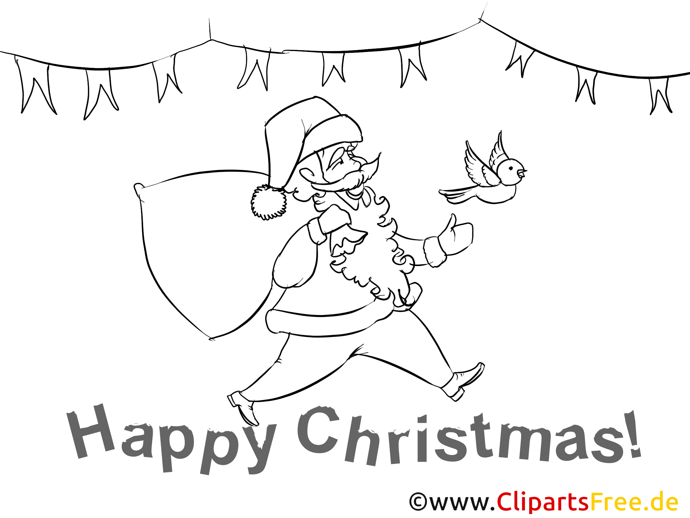 Schau mal, dieses Bild ist einfach zauberhaft! Da siehst du den fröhlichen Weihnachtsmann, der mit seinem dicken Sack voller Geschenke durch die Landschaft joggt. Er hat eine große, lustige Mütze auf und ein breites Grinsen im Gesicht. Neben ihm fliegt ein kleines Vögelchen, das munter mit ihm plaudern könnte – vielleicht über die besten Geschenke! Und ganz oben schwingen ein paar bunte Fähnchen im Wind. Das Geschriebene „Happy Christmas!“ kommt dazu und bringt sofort gute Laune!