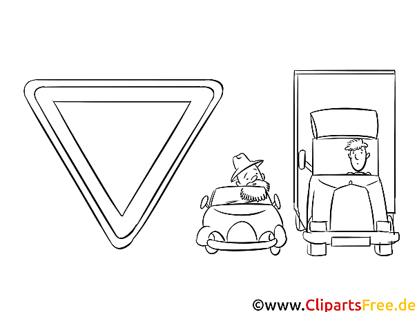 Das Bild zeigt eine interessante Verkehrsszene. Ganz links erkennt man ein großes, markantes Vorfahrt gewähren-Schild. Rechts gibt es zwei Fahrzeuge, die sich offenbar begegnen. Da ist zum einen ein kleines, knuffiges Auto mit einem Fahrer, der sehr lustig aussieht, vielleicht ein bisschen strafend oder nachdenklich. Neben ihm steht ein größerer Lkw mit einem Fahrer, der gelassen wirkt. Diese Darstellung weckt Interesse – wie wird die Situation wohl weitergehen? Kinder können sich viele Geschichten dazu ausdenken, während sie das Bild ausmalen.