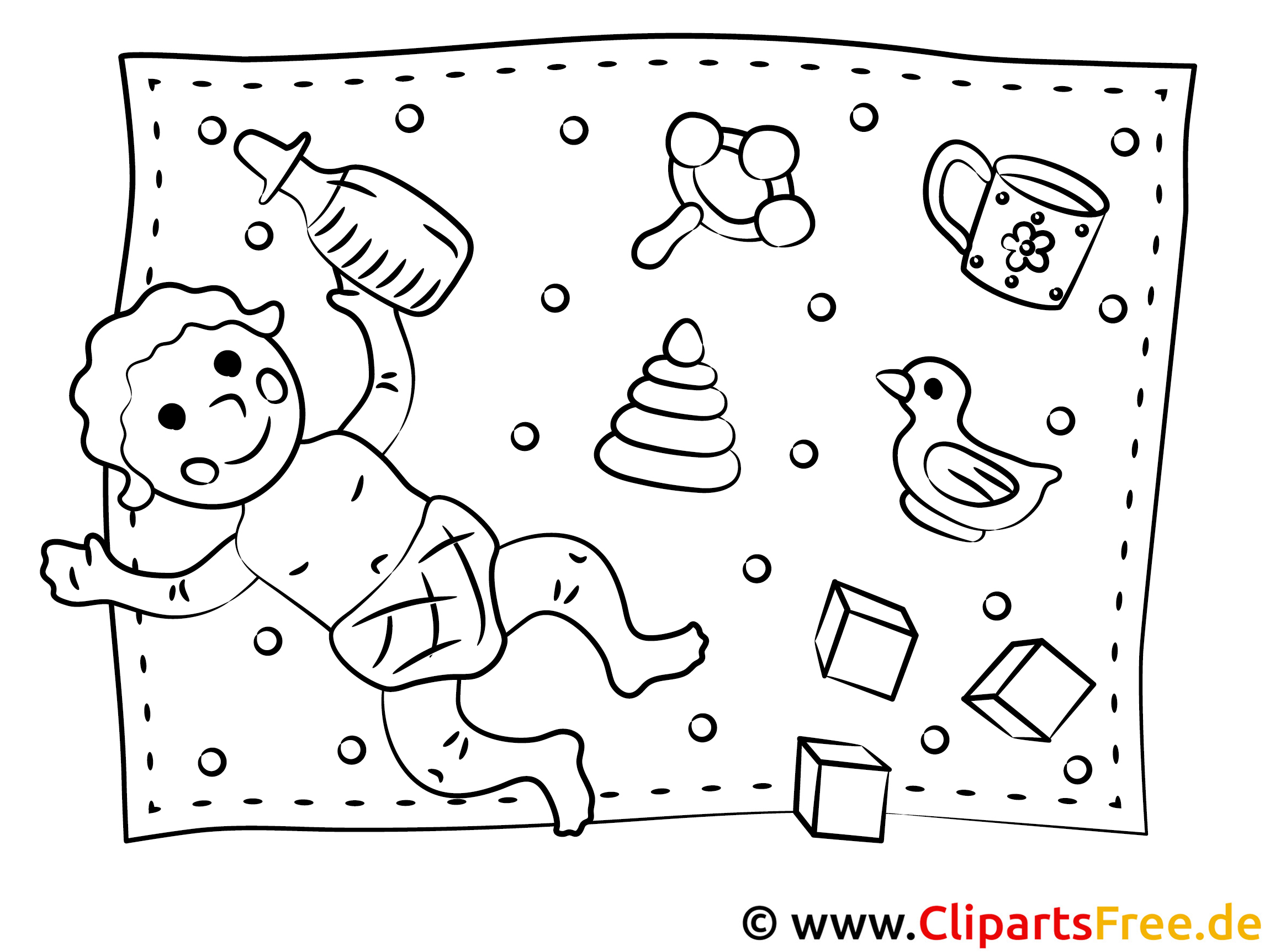 Auf diesem niedlichen Ausmalbild liegt ein kleines Baby auf einer bunten Decke. Es hält eine Flasche in der Hand, die richtig putzig aussieht. Um es herum gibt es verschiedene Spielsachen – einen bunten Becher mit einem blühenden Muster, ein lustiges Rasselspielzeug und sogar einen kleinen Vogel, der neugierig schaut. Außerdem ist da noch etwas, das wie ein türmchenförmiger Stapel aussieht. So viele Elemente, die das Bild lebendig und ansprechend machen!