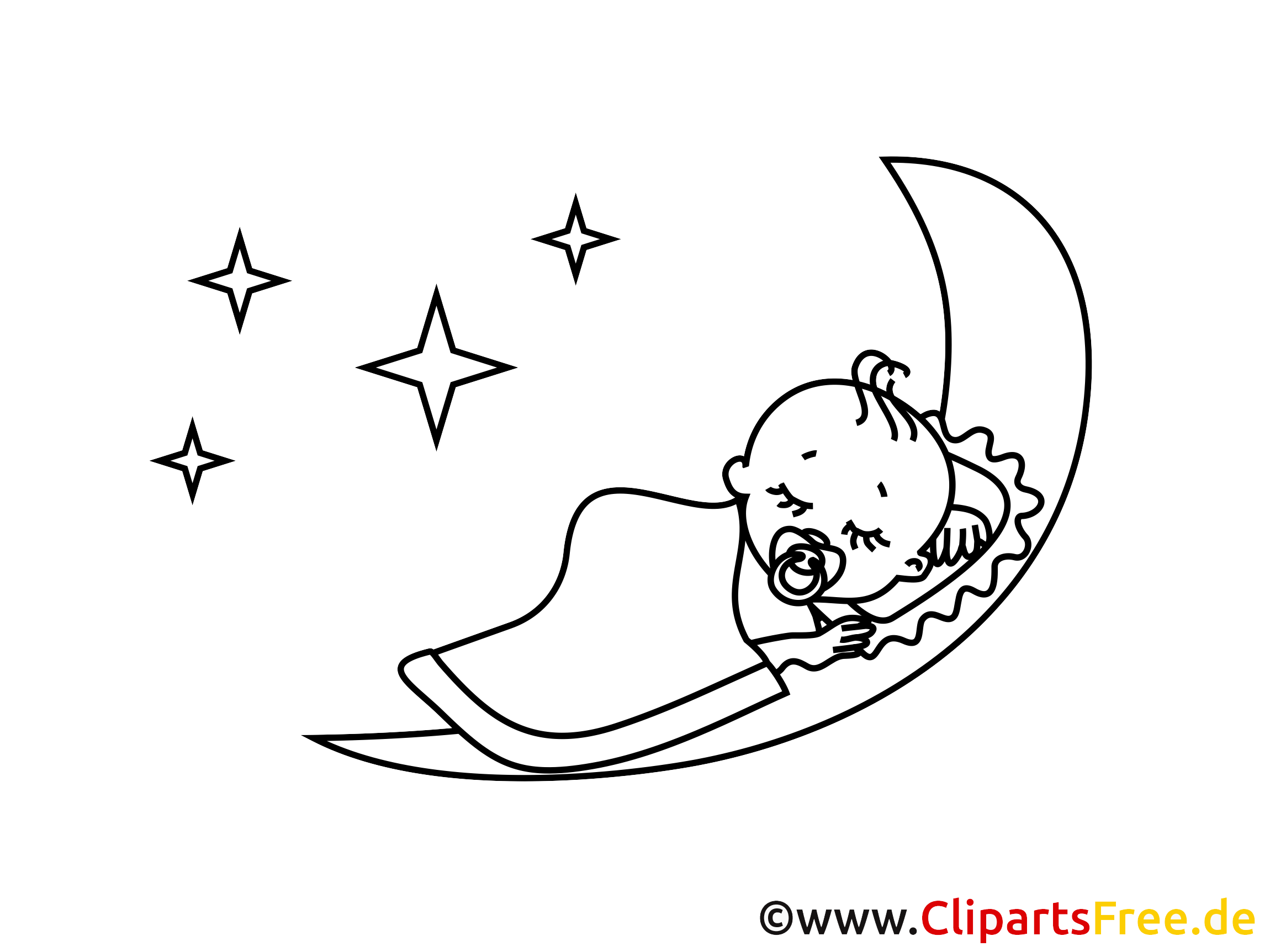 Das Bild zeigt ein süßes, schlafendes Baby, das auf einem großen, stilisierten Mond liegt. Umgeben von glitzernden Sternen, die nur darauf warten, ausgemalt zu werden, vermittelt die gesamte Szene eine friedliche, träumerische Atmosphäre. Das schlafende Kind hat einen Schnuller im Mund und ist sanft in eine Decke gehüllt. Super niedlich! Man könnte meinen, es macht sich gerade auf eine Reise ins Land der Träume. Ideal, um die Fantasie der Kleinen anzuregen.
