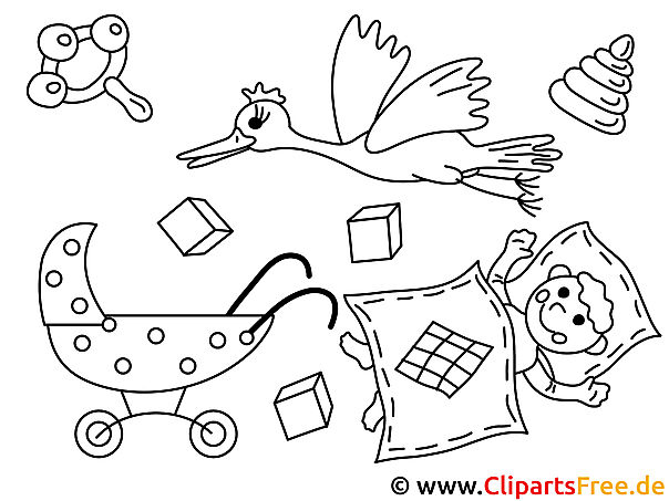 Das vorliegende Ausmalbild zeigt eine fröhliche, lebhafte Szene, die ganz im Zeichen der Familie und des neuen Lebens steht. Ein kleiner, drolliger Storch schwebt über einem bunten Kinderwagen. Im Wagen selbst liegt ein süßes Baby, das sanft schläft oder die Umwelt beobachtet. Ganz in der Nähe sehen wir einige zauberhafte, geometrische Spielblöcke und eine fröhlich klingende Rassel. Insgesamt strahlt das Bild eine frische, liebevolle Atmosphäre aus, die richtig einladend wirkt.