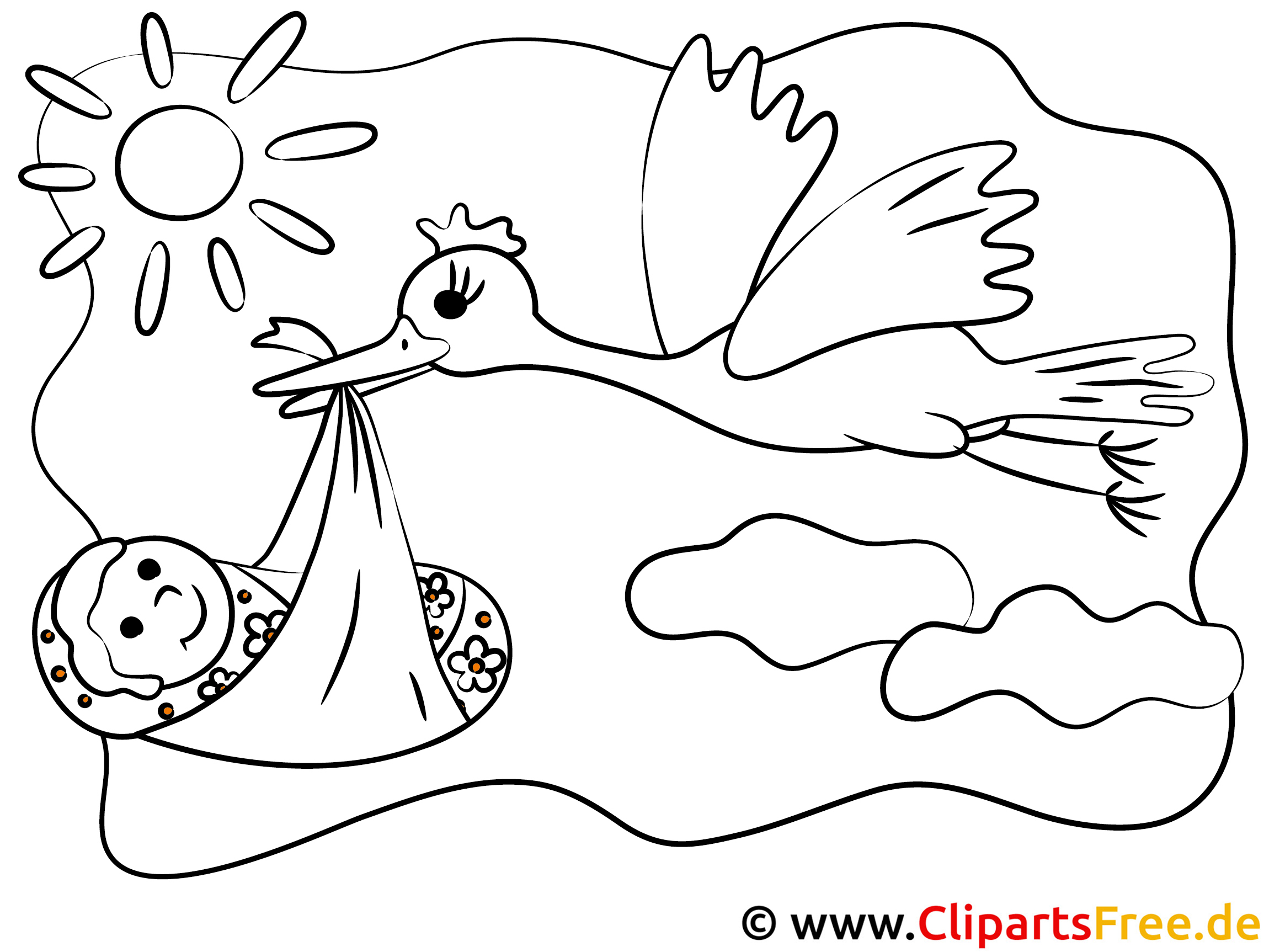 Das hier ist ein zauberhaftes Malbild, das einen eleganten Storch zeigt, der ein kleines Baby in einem Tuch hält. Der Storch fliegt durch die Luft, umgeben von fröhlichen Wolken und einer strahlenden Sonne. Man kann die kleinen Details gut erkennen: das gewickelte Baby hat sogar eine hübsche Decke mit bunten Blumenmustern. Einfach süß, oder? Ideal für Kinder, die gerne Farben und Gefühle in ihre Zeichnungen einbringen. Hier können ganz viele Farbideen und Kreativität ausgedrückt werden!