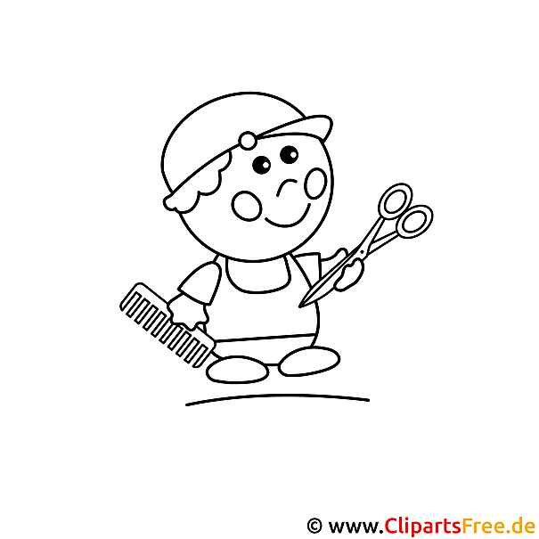 Das Bild zeigt einen fröhlichen kleinen Friseur – super niedlich! Er hat eine Mütze auf und lächelt übers ganze Gesicht. In seiner einen Hand hält er eine große Schere, das ist ja sehr praktisch, um Haare zu schneiden, und in der anderen Hand einen Kamm. Der kleine Helfer scheint bereit zu sein, jede Frisur zu verwandeln. Er steht auf einem bogenförmigen Weg, der dem Ganzen eine gewisse Dynamik verleiht. Die Umrisse sind klar und einfach, sodass beim Ausmalen keine Fläche übersehen werden kann.