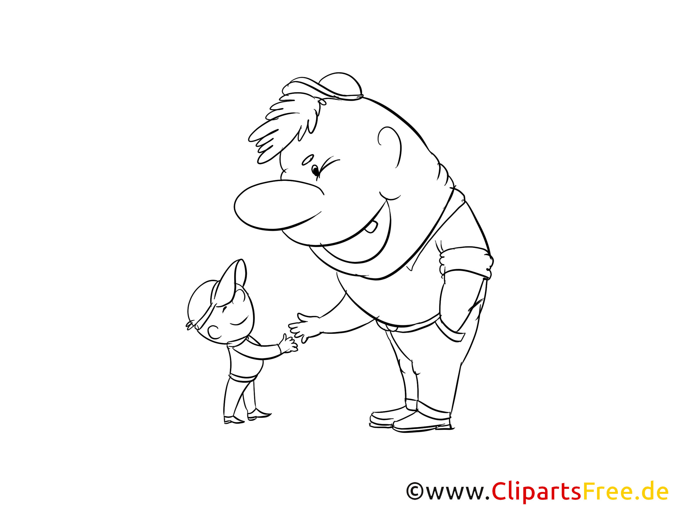 Oh, schau mal! In diesem süßen Ausmalbild siehst du einen größeren Mann, der mit einem kleinen Jungen redet. Der Junge hat eine Kapuze auf und lächelt so freundlich, woogiewoogie. Der Mann, ein rechter Kerl mit einem breiten Grinsen, schaut ganz fröhlich herunter. Es wirkt fast so, als würde er dem kleinen Freund etwas Spannendes erzählen oder ihm ein Geheimnis verraten! Die beiden sind wirklich gut drauf, das könnte in einem Park oder auf einem Spielplatz sein. Diese Szene lädt förmlich dazu ein, mit bunten Farben zum Leben erweckt zu werden.