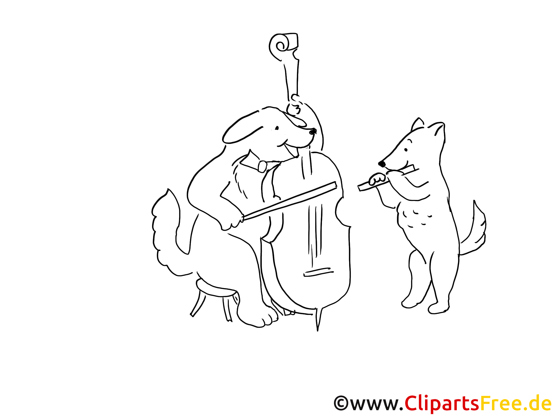 Hier sehen wir ein sehr charmantes Motiv. Ein Hund sitzt auf einem Hocker und spielt fröhlich Cello, während ein kleiner, fröhlicher Fuchs daneben steht und mit einer Flöte mitsingt. Die beiden scheinen richtig in ihre Musik vertieft zu sein, was uns einfach zum Schmunzeln bringt. Das Bild strahlt eine positive Energie aus. Das freundliche Gesicht des Hundes und die Lebensfreude des Fuchses sind einfach zum Verlieben! Es eignet sich bestens als Ausmalbild für Kinder, die Musik und Tiere lieben.