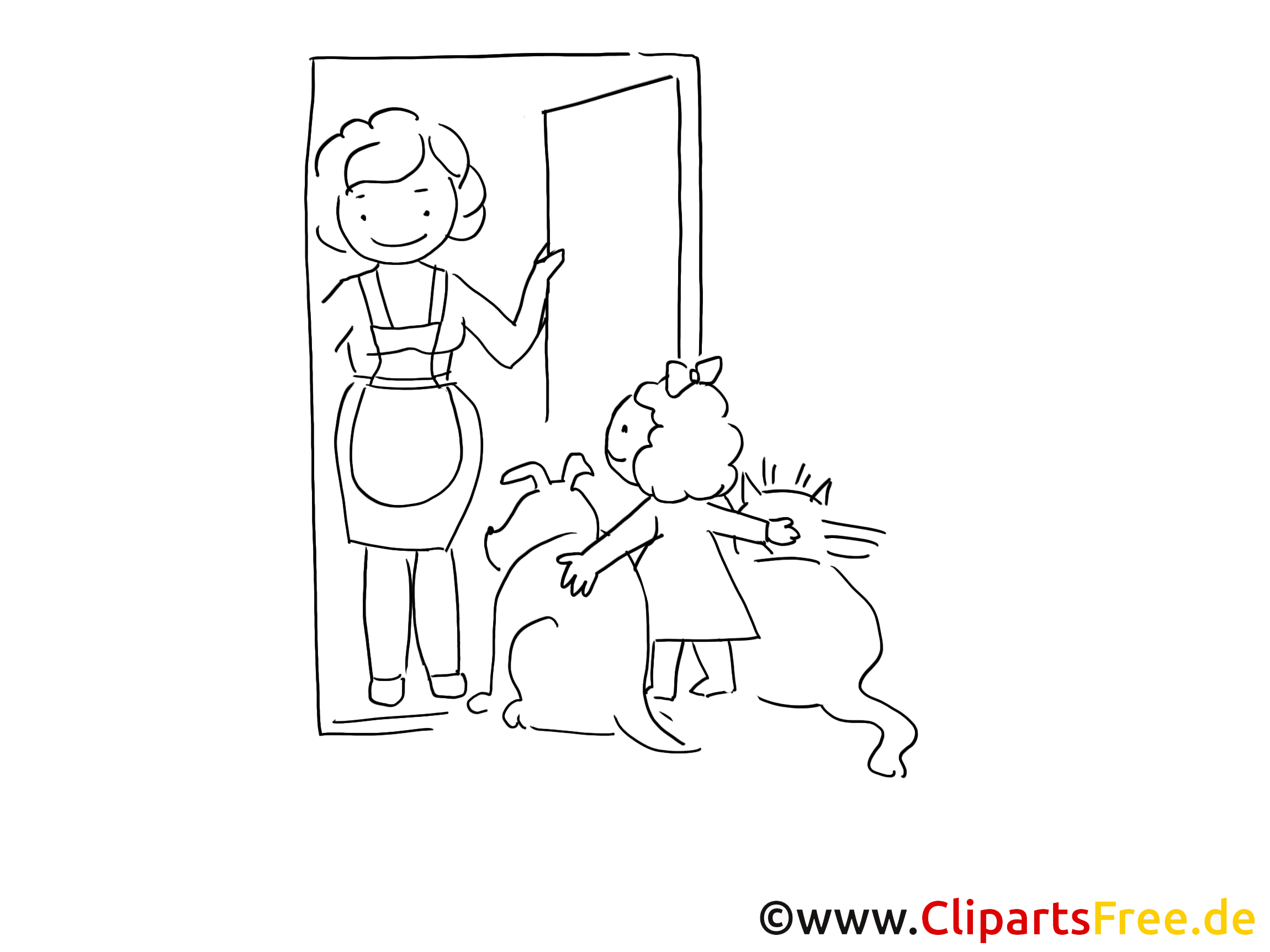 Stell dir vor: Ein fröhliches Bild, das eine kleine Szene zeigt. Da steht ein nettes Mädchen an der Tür, mit einem lächelnden Gesicht. Sie hat einen Knoten im Haar, mit einem süßen Kleidchen – einfach zauberhaft! Und dann ist da noch eine Frau, vielleicht die Mama oder eine Tante, die freundlich in der Tür steht. Die Szene strahlt Wärme und Herzlichkeit aus, als ob etwas Schönes passiert. tja, Vielleicht kommt das Mädchen nach Hause oder hat ein tolles Abenteuer erlebt – die Möglichkeiten sind endlos. Ein echter Hingucker, der darauf wartet, farbenfroh ausgefüllt zu werden!