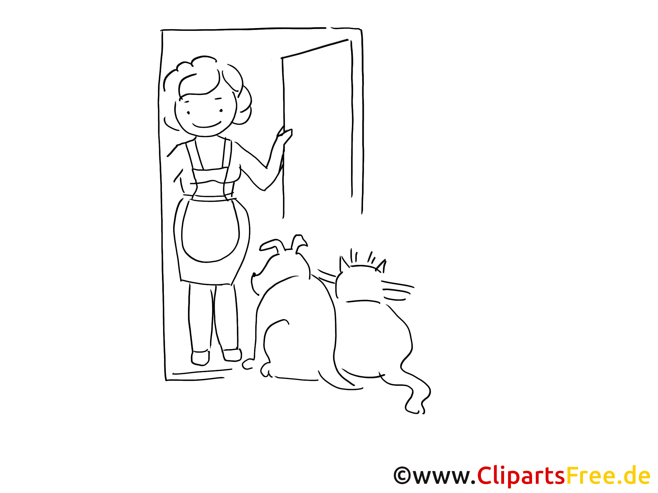 Stell dir vor, da steht eine fröhliche Frau in der Tür! Sie lächelt, als ob sie gerade Besuch erwartet oder vielleicht etwas Leckeres kochen will. Neben ihr warten zwei neugierige Tiere: ein Hund und eine Katze. Der Hund sieht ganz aufgeregt aus, während die Katze vielleicht etwas entspannter wirkt. Es ist eine ganz gemütliche Szene, die sofort ein schönes Gefühl von Zuhause vermittelt. An einem verregneten Nachmittag könnte dieses Bild eine hübsche Malvorlage sein, um die Farben lebendig werden zu lassen.