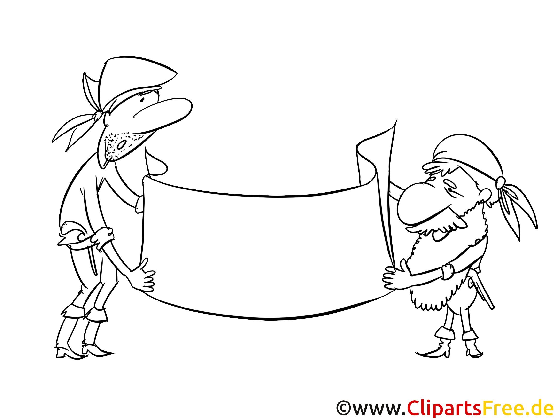 Hier sehen wir zwei lustige Piraten, die gemeinsam ein großes, leeres Banner halten. Die beiden sehen ziemlich neugierig aus, als ob sie auf eine spannende Ankündigung warten würden. Was könnte da wohl draufstehen? Der eine Pirat hat einen üppigen Bart und einen breiten Hut, während der andere mit seinem Tuch auf dem Kopf viel Charme versprüht. Beide strahlen eine komische Alltagskomik aus – typisch für das Leben der Seehelden. halt, Vielleicht sind sie auf der Suche nach einem Schatz? Oder planen sie eine große Party auf hoher See? Da ist die Fantasie der Kinder definitiv gefragt!