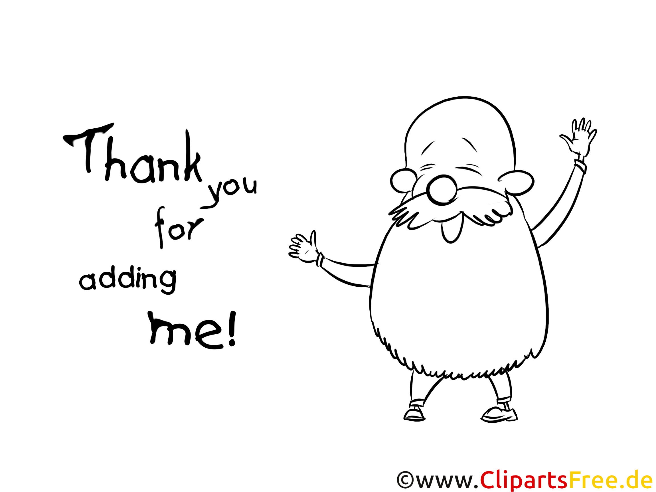Das Motiv zeigt einen fröhlichen, älteren Mann mit einem großen, grauen Bart. Er hat eine runde, baldige Kopfhaut und ist mit einem einfachen, aber niedlichen Outfit gekleidet. Seine Arme sind weit geöffnet, als würde er sich auf eine einladende Art und Weise freuen. Außerdem steht unter ihm der Schriftzug „Thank you for adding me!“, was die positive Ausstrahlung des Bildes noch unterstreicht. Wenn man genau hinschaut, sieht man die kleinen, liebevollen Details – wie die runden Brillengläser, die eine ganz eigene Charakteristik verleihen. Wirklich charmant und freundlich!