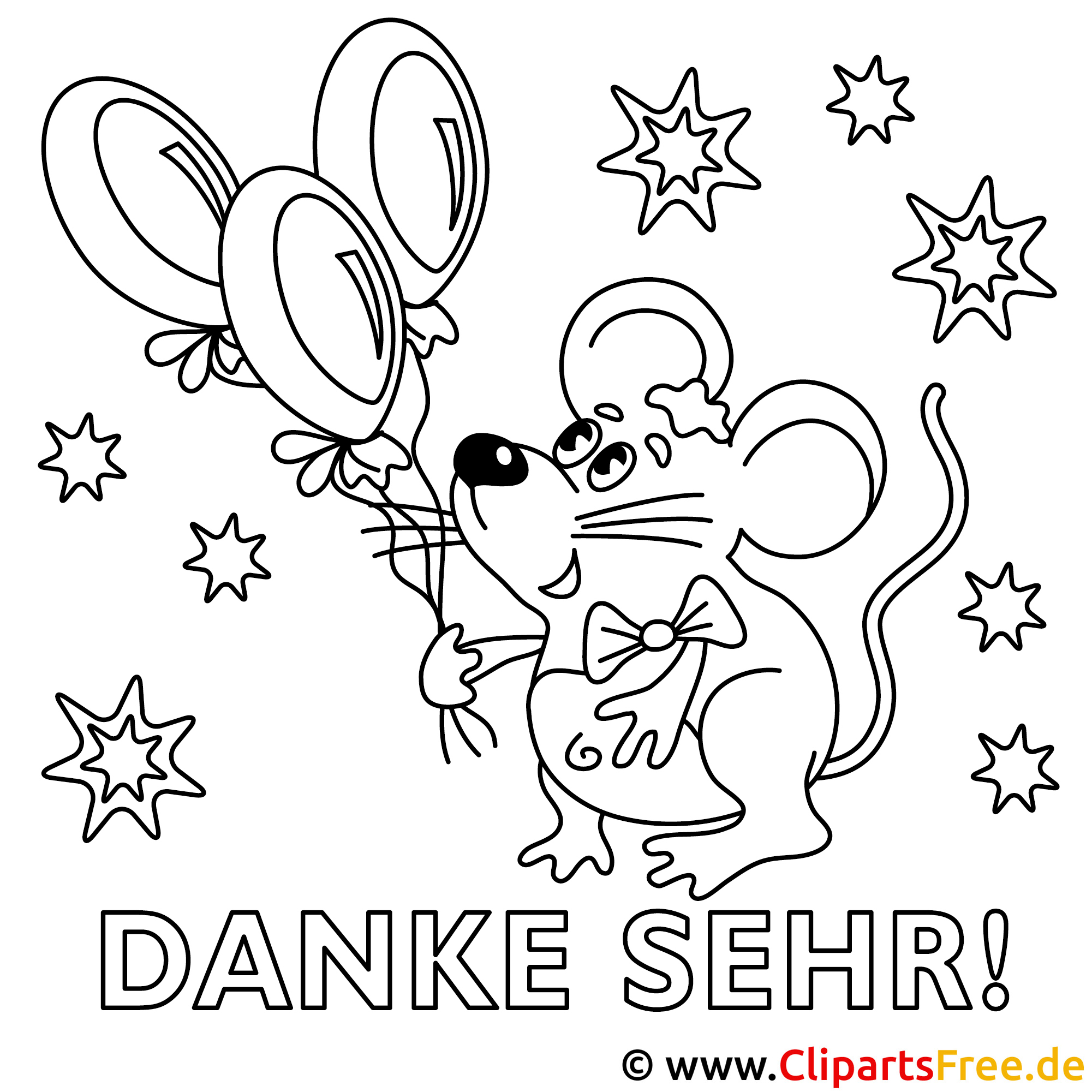 Schau dir dieses süße Bild an! Eine kleine Maus steht fröhlich mitten im Raum und hält zwei große Luftballons in der Hand. Ihre großen, runden Ohren und das freundliche Gesicht machen sie einfach liebenswert. Übrigens, sie trägt sogar eine niedliche Schleife um ihren Hals. Um sie herum leuchten bunte Sterne, die dem Bild eine fröhliche Stimmung verleihen. Ganz unten steht in großen Buchstaben „DANKE SEHR!“.... also, Ein echt ganz tolles Motiv, um anderen zu danken und Freude zu verbreiten.
