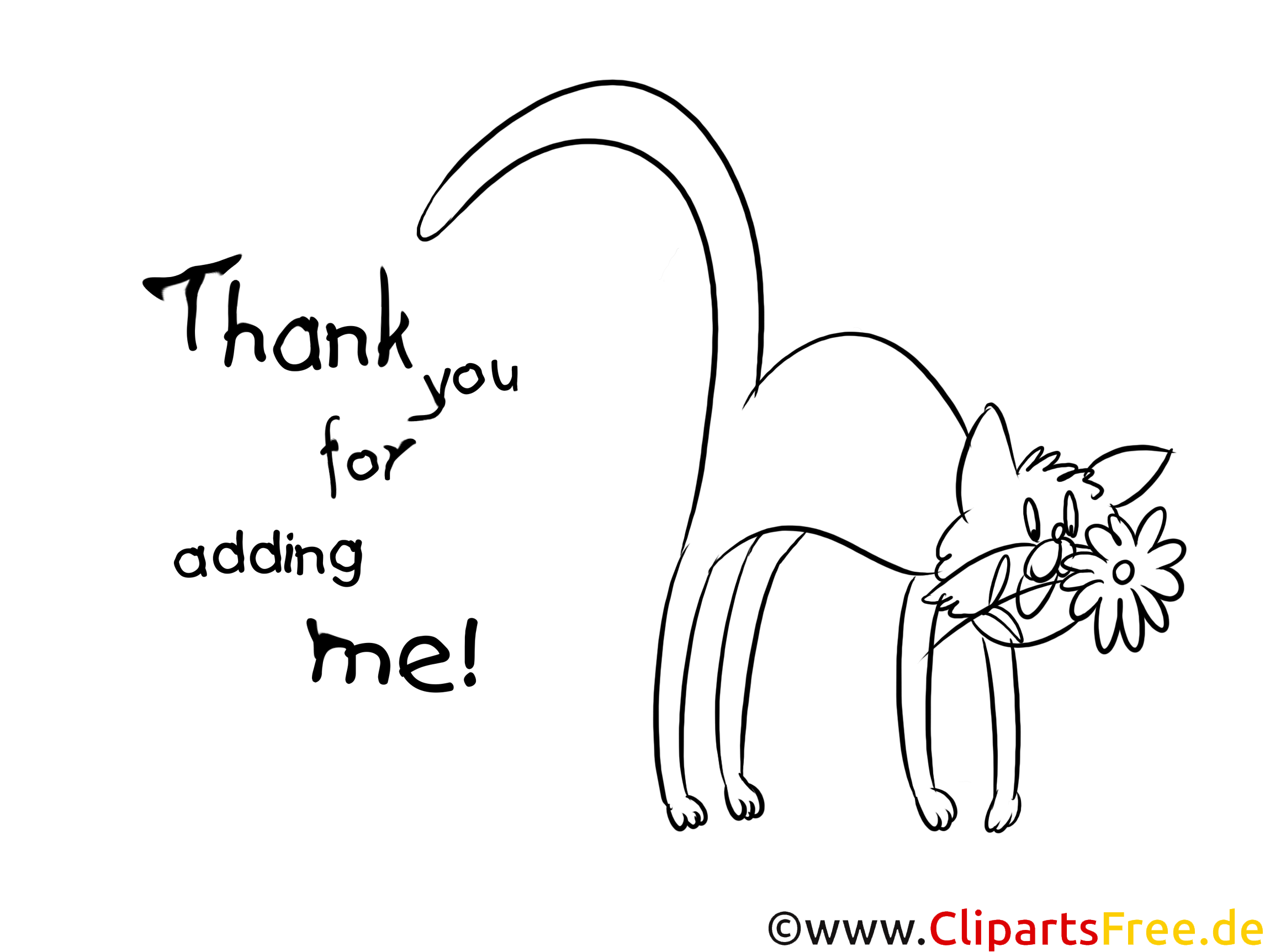 Dieses niedliche Ausmalbild zeigt eine fröhliche Katze, die mit einer kleinen Blume im Mund dasteht. Die Katze hat große, ausdrucksstarke Augen und steht in einer lockeren Pose. Man kann fast spüren, wie sie sich freut, die Blume zu präsentieren. Dazu kommt der Text „Thank you for adding me!“, der einfach süß und einladend ist. Das Bild wirkt sehr lebendig, aber gleichzeitig auch beruhigend, denn die Linien sind klar und einfach gehalten — . Perfekt, um Notizen oder Grüße auf eine kreative Weise zu verschönern!