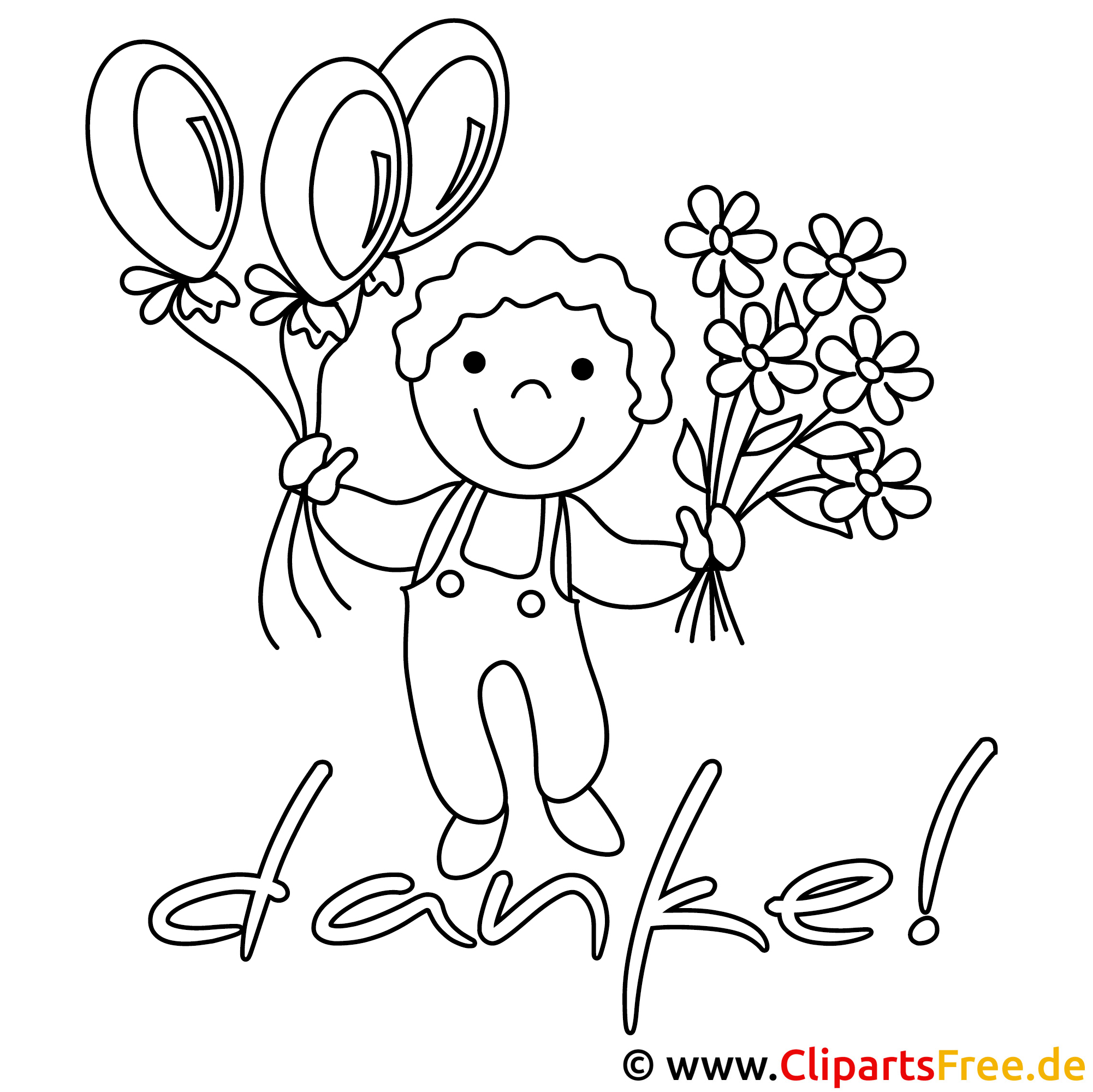 Das Ausmalbild zeigt ein fröhliches Kind, das offensichtlich etwas zu feiern hat. Mit einem großen Lächeln im Gesicht hält es in den einen Händen bunte Luftballons und in der anderen einen Strauß Blumen. Die Mischung aus Glück und Dankbarkeit ist so wunderbar greifbar! Unterhalb des Kindes steht das Wort „danke!“ in verspielter Schrift, was das Gesamtbild zu einer tollen Vorlage für alle Arten von Dankesbotschaften macht.