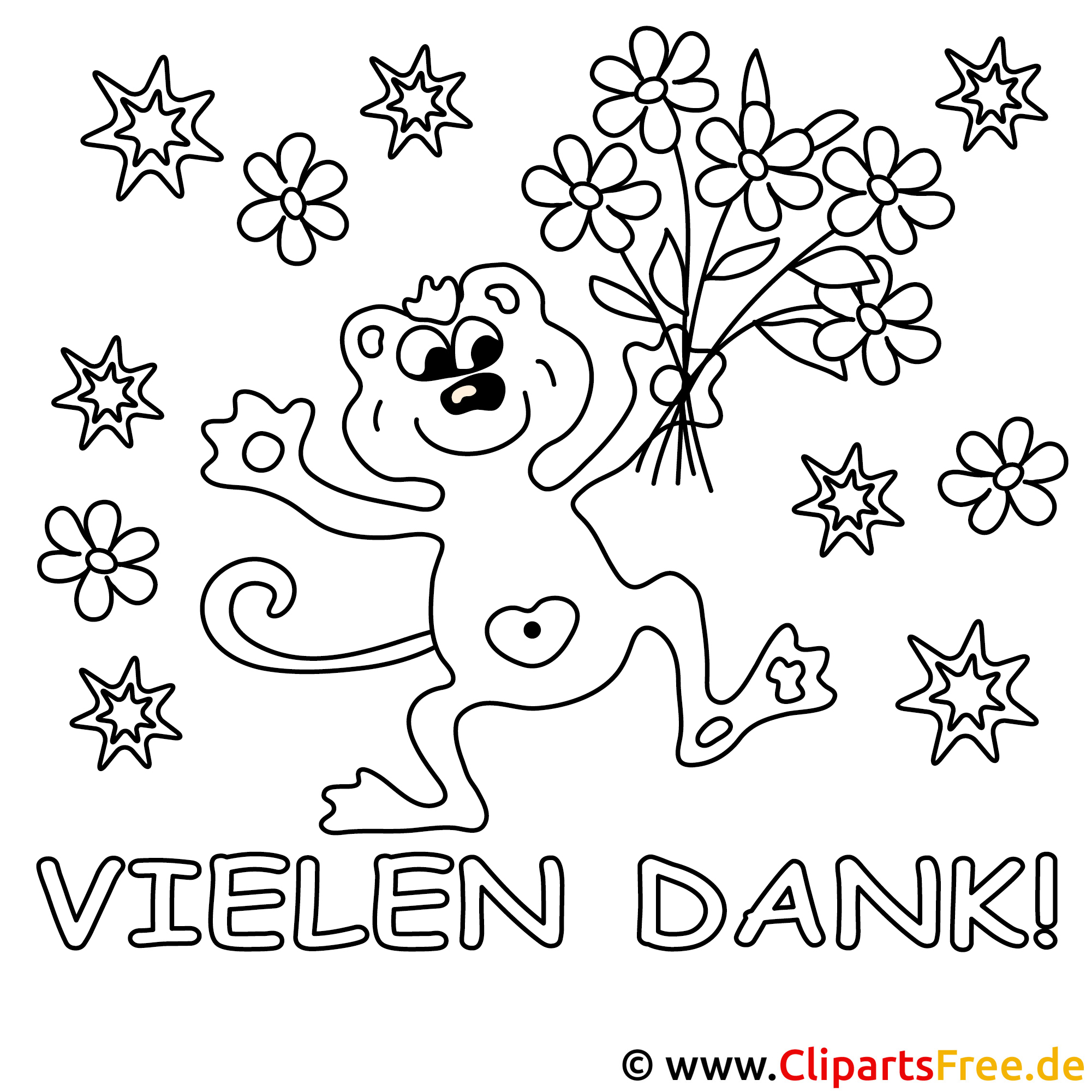 Das Bild zeigt ein fröhliches Wesen, das aussieht wie ein kleiner, liebenswerter Löwe. Mit einem ausgelassenen Tanz in der Mitte des Bildes hält es einen schönen Blumenstrauß in der Hand. Wer würde da nicht gerne mitfeiern? Um das Wesen herum blühen bunte Blumen und Funkelsterne platzen förmlich ins Bild. Dieser Katalog an fröhlichen Details lädt ein zum Ausmalen: es gibt viel zu entdecken! Währenddessen leuchtet der Ausdruck "VIELEN DANK!" in großen, klaren Buchstaben, das sorgt für die richtigen Akzente.