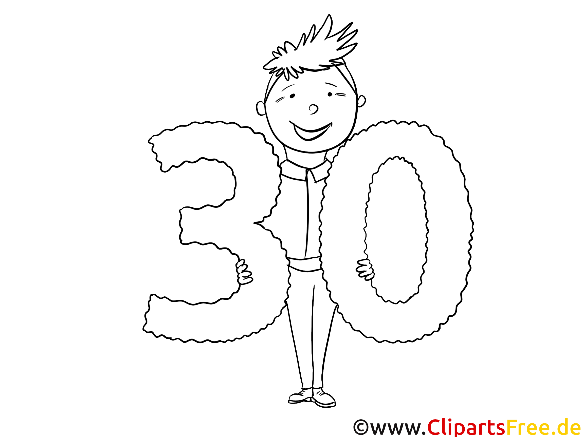 Hier haben wir ein fröhliches Ausmalbild, das einen jungen, strahlenden Jungen zeigt. Er hält stolz die Zahl „30“ in den Händen – man kann fast seine Freude spüren! Die Ziffern sind witzig und verschnörkelt, einfach zum Ausmalen. Das Kind hat eine lässige Frisur, die ein wenig wild wirkt, trotzdem irgendwie charmant ist. Wer würde da nicht gerne seine Farben drauflegen und ein bisschen kreativ werden?