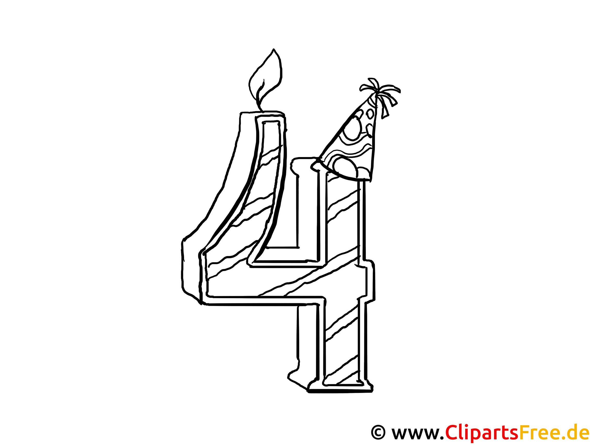Hier sehen wir die Zahl 4, ganz besonders mit einem kleinen, fröhlichen Geburtstags-Hütchen oben drauf! So ein Bild – besonders bunt – bringt echt gute Laune. Und guck mal, das Lichtlein auf der Torte, es leuchtet einladend und scheint fast zu flüstern: "Feier mit mir!" Die geschwungenen Linien und das lustige Design laden förmlich zum Ausmalen ein und machen das Ganze zu einer tollen Malvorlage, die auf keinen Kindergeburtstag fehlen sollte!
