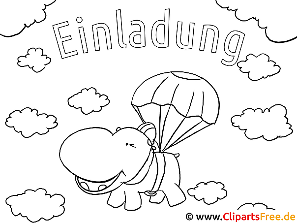 Der Zeichenstil ist insgesamt sehr niedlich und einladend. Die Linien sind klar und vor allem dick, was es einfach macht, das Bild zu kolorieren. Die Formen wirken kindlich verspielt – eine ideale Grundlage, um die Kreativität herauszulocken. Durch die unterschiedlich großen Wolken und den großen, fröhlichen Ausdruck des Nilpferds bleibt das Bild ansprechend und macht Lust auf Farben! Einige kinderfreundliche Details, wie die verspielt geschwungenen Buchstaben des Wortes "Einladung", runden das Ganze ab und machen es besonders lebendig — .
