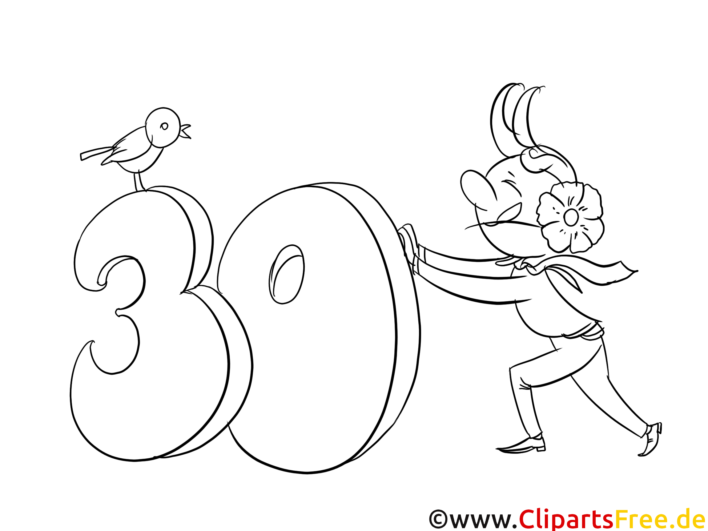 Das Bild zeigt eine lustige Szene: Ein fröhlicher kleiner Mensch mit einem Kapuzenumhang und einer großen, blühenden Blume im Haar, der voller Energie eine riesige „30“ anstößt. Neben ihm sitzt ein kleiner Vogel, der interessiert zuschaut. Die Figur lächelt breit, als ob sie gleich etwas Großartiges anstellt. Es ist eine lebendige Darstellung, die Freude und Schwung vermittelt. Ein ideales Ausmalbild für Kinder, die mit diesem Motiv sicher viel Spaß haben werden!