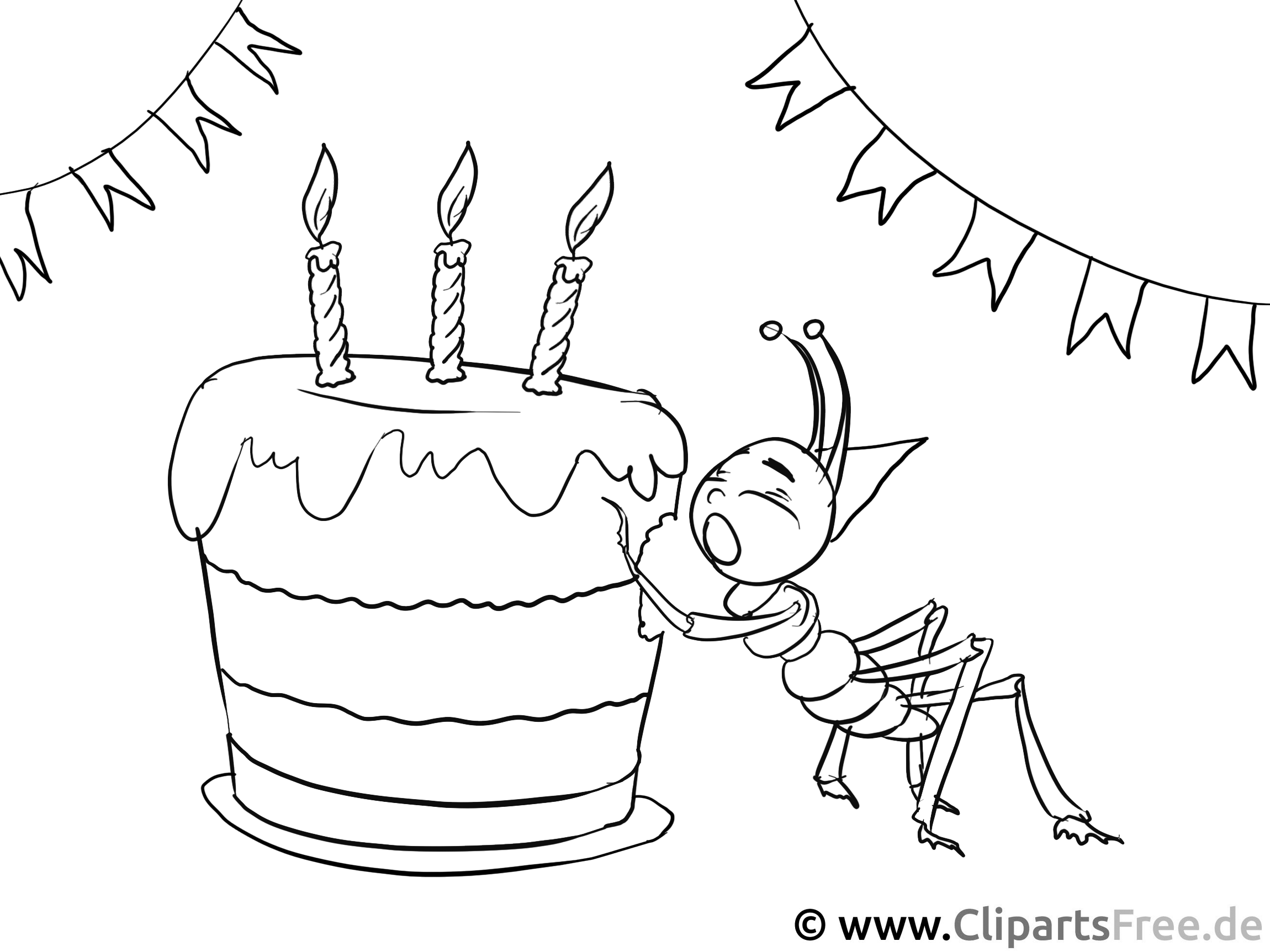 Stell dir vor, eine fröhliche kleine Ameise feiert ihren Geburtstag! Mit einem strahlenden Gesicht, das pure Freude versprüht, umarmt sie einen riesigen, köstlichen Kuchen. Drei leuchtende Kerzen stehen auf dem süßen Highlight des Tages und sorgen dafür, dass die Stimmung perfekt ist. Banner und Luftballons im Hintergrund verleihen dem Bild eine fröhliche Ausstrahlung, die wirklich zum Mitfeiern einlädt. Das Bild zeigt diese charmante Szene in einer Art, die ganz viel Raum für Kreativität bietet. Es ist einfach zum Ausmalen!