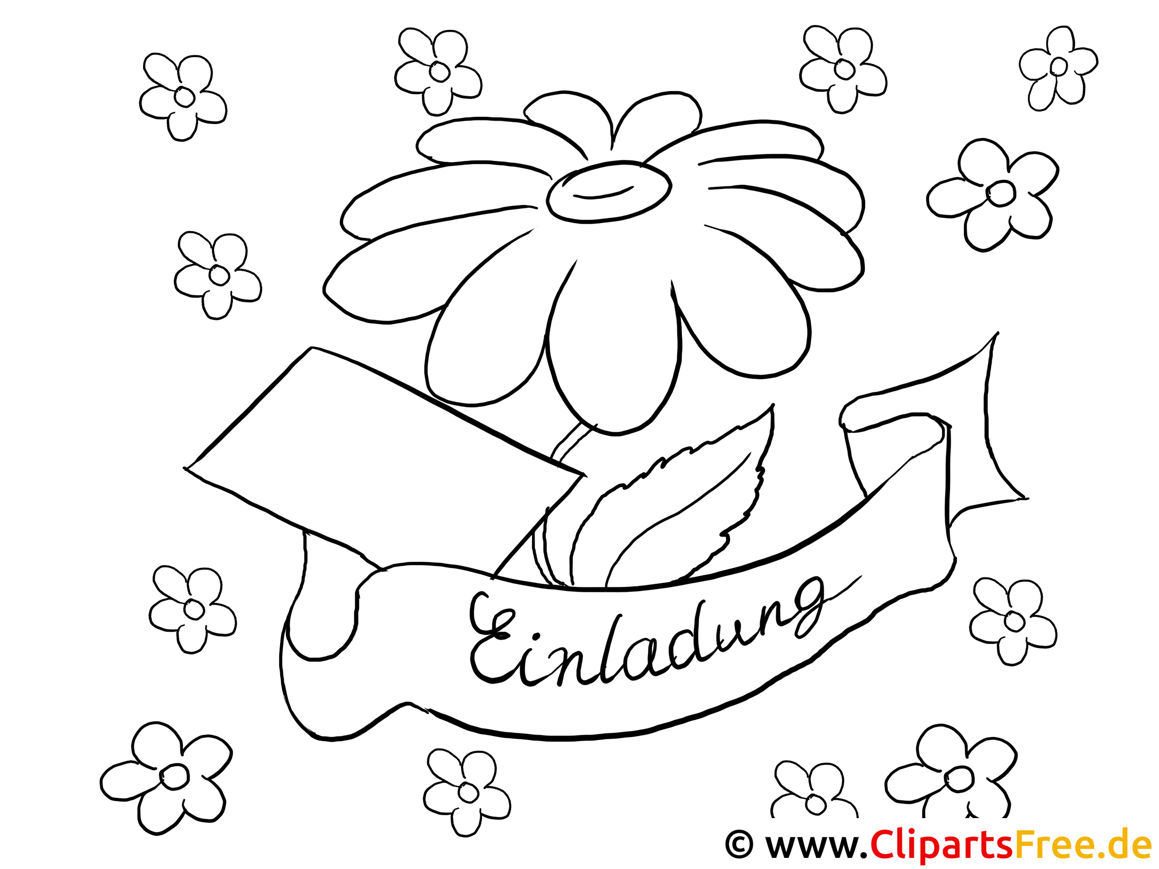 Das Motiv dieser Malvorlage ist wirklich süß und einladend! In der Mitte prangt eine große, fröhliche Blume, die mit ihren vielen blütenweißen Blütenblättern strahlt. Und dann, ganz praktisch, liegt ein Umschlag daneben – perfekt für eine Einladung! Auf einem geschwungenen Banner steht das Wort „Einladung“. Die kleinen Blumen umgeben das Hauptmotiv und geben dem Bild eine verträumte, fröhliche Atmosphäre. Es ist toll, wie diese Kombination das Gefühl von Fröhlichkeit und Kreativität weckt, oder? Ich kann mir gut vorstellen, dass Kinder gleich darüber nachdenken, wie sie die Blume am besten bunt gestalten!