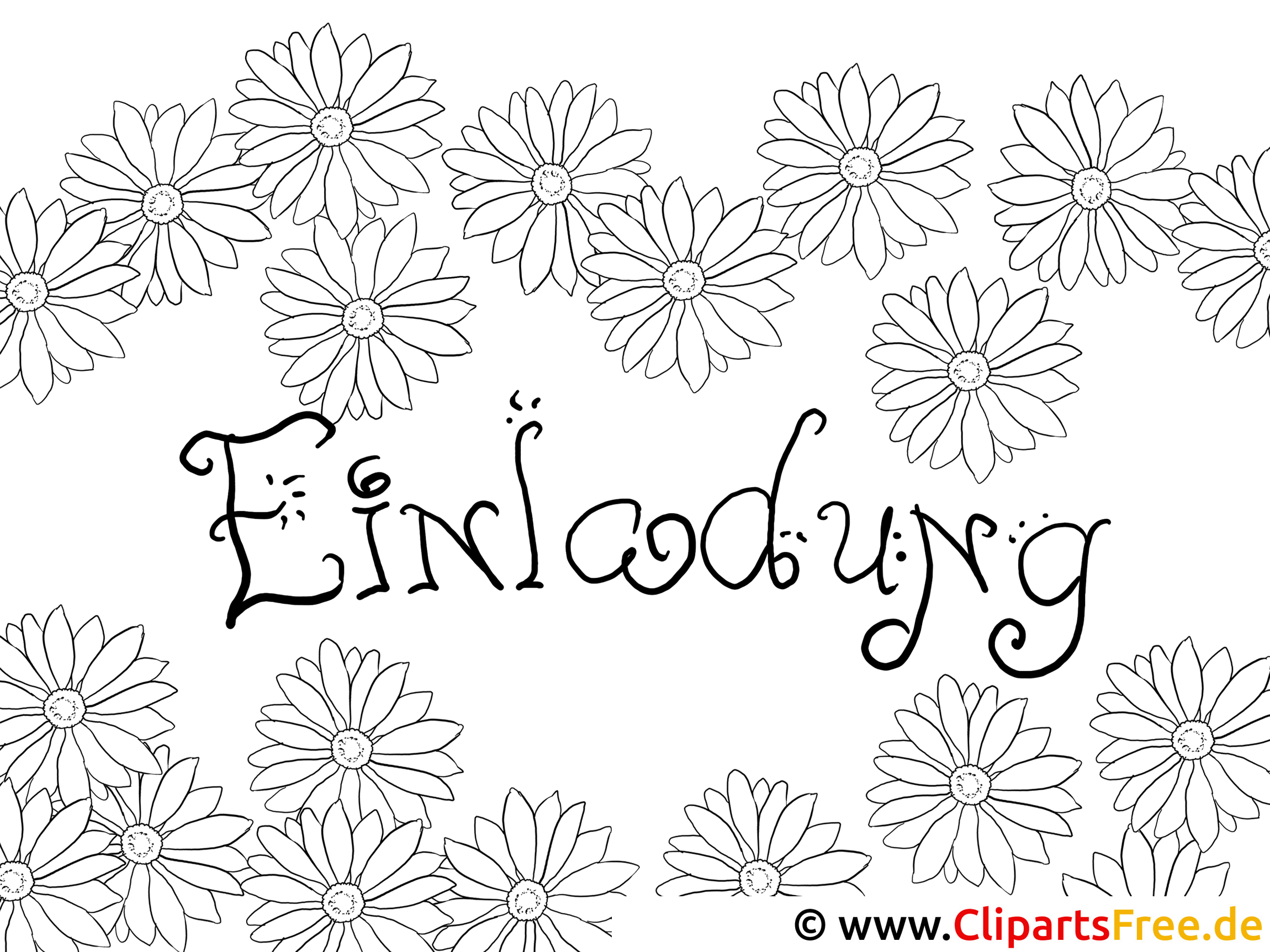 Hier haben wir ein wunderschönes Bild zum Ausmalen, das im Mittelpunkt eine verspielte Einladung zeigt, umgeben von fröhlichen Margeriten. Diese zauberhaften Blumen laden zum Träumen ein – ideal für Feste oder besondere Anlässe. Die einzelnen Blüten blühen in voller Pracht und die geschwungene Schrift verleiht der Einladung etwas Einzigartiges. Man könnte beinahe den Duft der Blumen riechen, wenn man sich das Bild ansieht!
