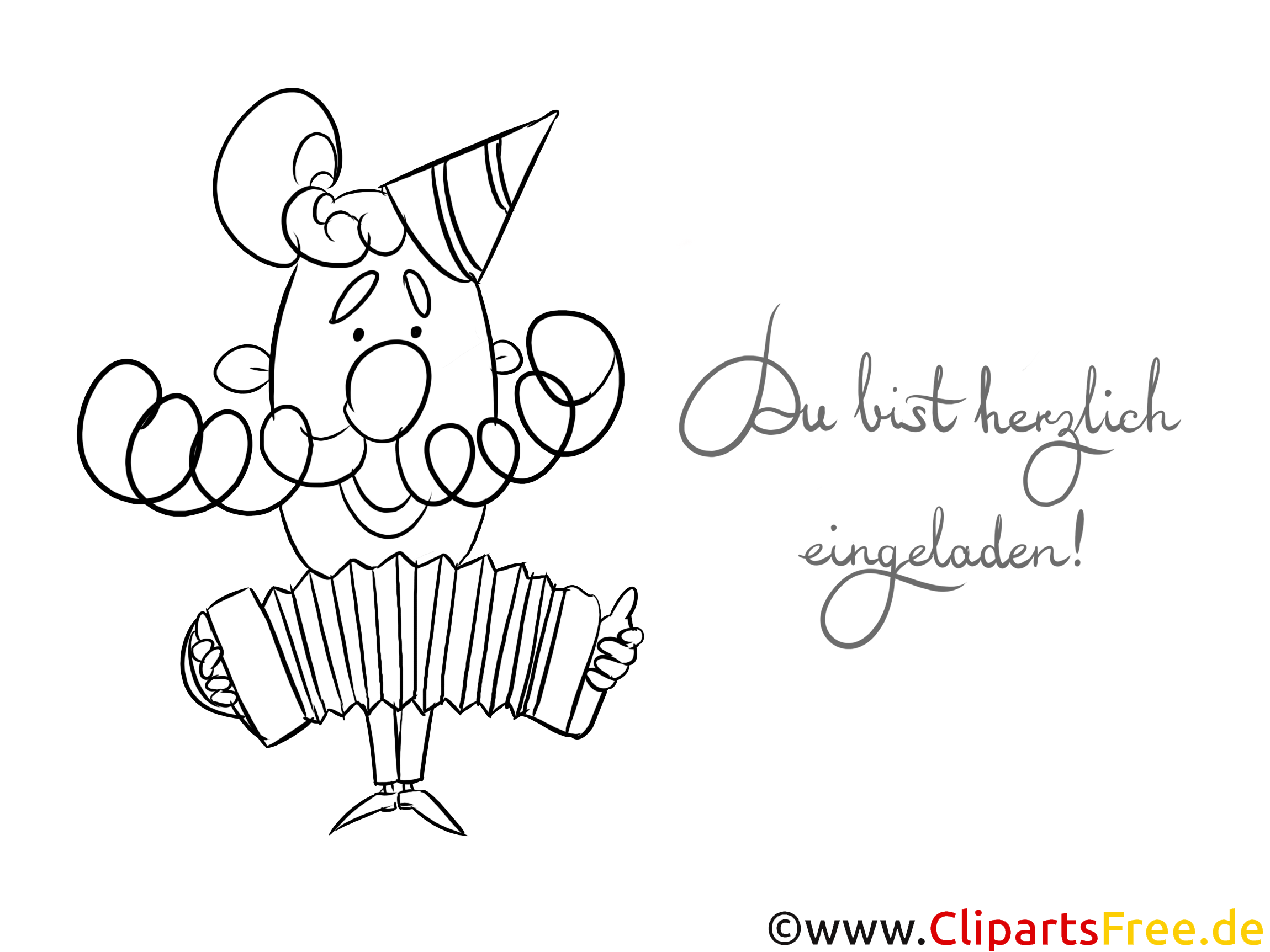 Stell dir vor, du siehst einen fröhlichen Clown, der mit seinem breiten Grinsen und den bunten, lockigen Haaren gleich gute Laune verbreitet! Er trägt eine lustige Partyhut, als würde er allen sagen: „Kommt vorbei und feiert mit mir!“ Sein Körper ist geschmückt mit einer großen, fröhlichen Ziehharmonika, die irgendwie die Stimmung hebt. Und ja, ganz charmant hat er auch einen einladenden Spruch dabei: „Du bist herzlich eingeladen!“ Das Bild zaubert nicht nur ein Lächeln, sondern regt auch die Fantasie an – was für eine Feier könnte das sein? Eine Geburtstagsparty? Ein Karnevalsfest?