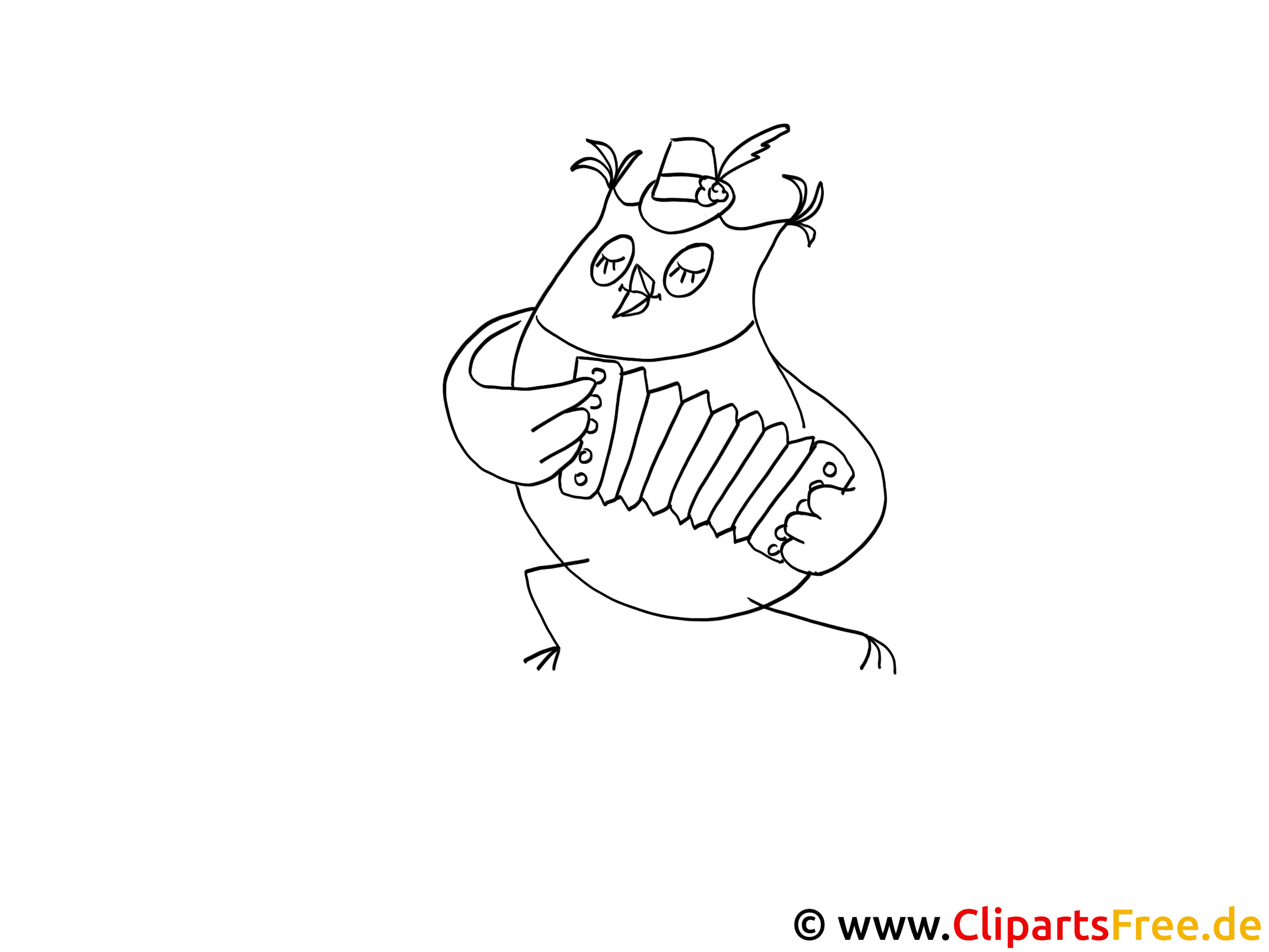 Hier haben wir ein ganz tolles Bild zum Ausmalen! Es zeigt eine lustige Eule, die mit einem Akkordeon musiziert. Ja, genau, das Instrument! Man sieht sogar, dass die Eule ein kleines Hut trägt. Ihre Augen sind ganz konzentriert, als ob sie in einen großartigen Song vertieft ist. Die Füße sind fest auf dem Boden, aber man könnte denken, dass sie gleich zu tanzen beginnt. Es ist wirklich ein fröhliches Motiv, das einfach Freude macht!