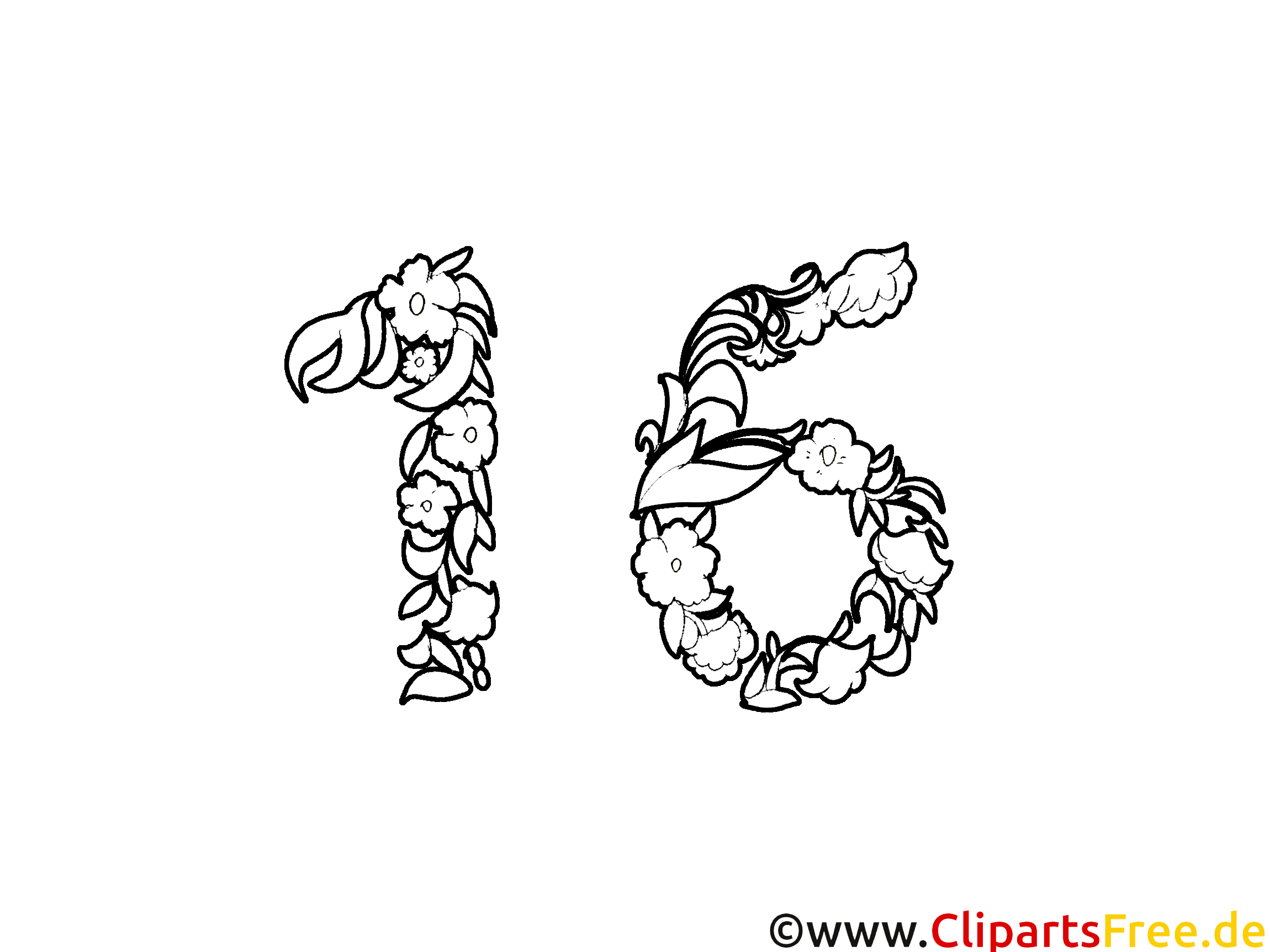 Das Bild zeigt die Zahl 16, schön umgeben von zarten, floralen Elementen. Die Blumen sind verspielt angeordnet und verleihen der Ziffer einen charmanten und lebendigen Look. Jedes Blatt, jede Blüte scheint im Detail mit viel Liebe gezeichnet worden zu sein, was es zu einer tollen Malvorlage macht. Der Gesamteindruck ist einfach fröhlich und einladend, perfekt für junge Künstler, die gerne mit Farben experimentieren.