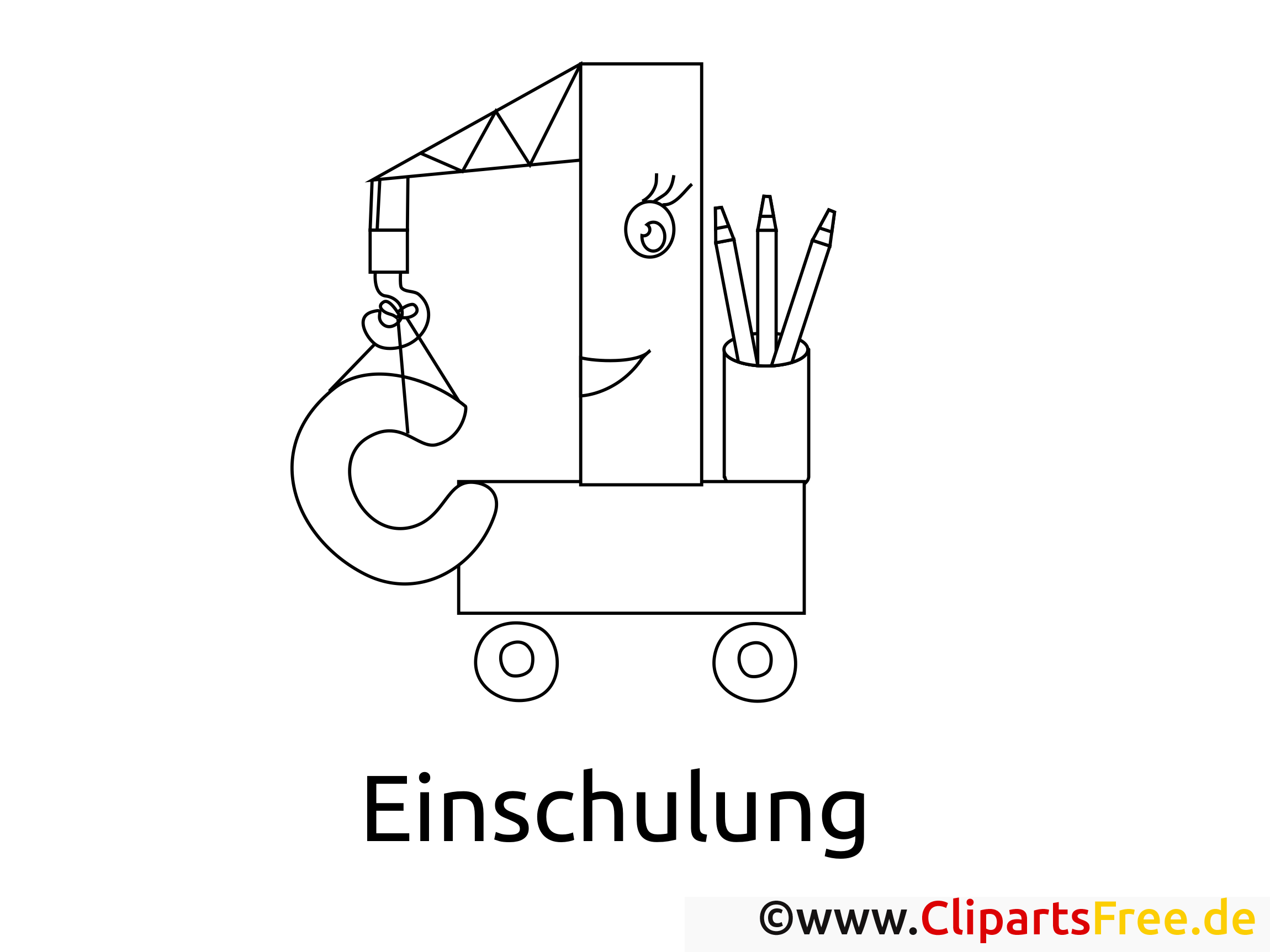 Das Ausmalbild zeigt einen niedlichen, farbenfrohen Schulkran – ja, richtig gehört! Der Kran ist wie ein kleiner Freund gestaltet und hat ein breites, fröhliches Gesicht. Die großen, runden Augen und die seitlich hängenden Stifte machen ihn wirklich sympathisch. Unten auf dem Bild steht „Einschulung“ in klaren, modernen Buchstaben. Übrigens, eine perfekte Vorlage für alle, die sich auf den Schulstart freuen. Denn dieser Kran könnte die ganzen Bürowaren und Schulsachen ganz stolz transportieren!