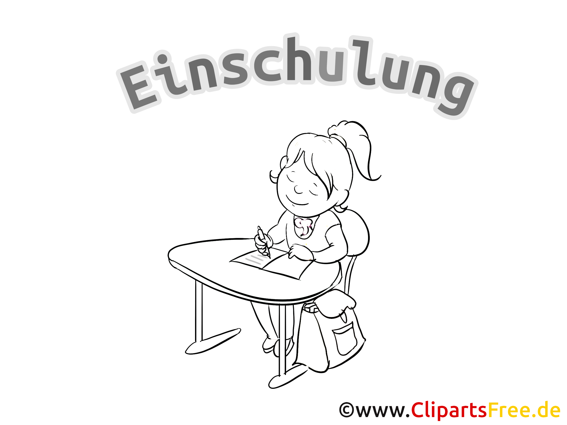 Das Ausmalbild zeigt ein freudiges Mädchen, das konzentriert an einem Tisch sitzt und etwas auf ein Blatt Papier zeichnet oder schreibt. Mit einem ganz breiten Lächeln auf dem Gesicht strahlt sie förmlich vor Begeisterung – eine echte Einschulungsatmosphäre! Im Hintergrund schwebt das Wort "Einschulung", was das Thema des Bildes unterstreicht. Vielleicht träumt das Mädchen von ihrem ersten Schultag oder von den vielen Abenteuern, die vor ihr liegen. Die Darstellung wirkt einladend und bringt das Gefühl von Aufregung und Vorfreude, das mit der Einschulung verbunden ist, ganz wunderbar rüber.