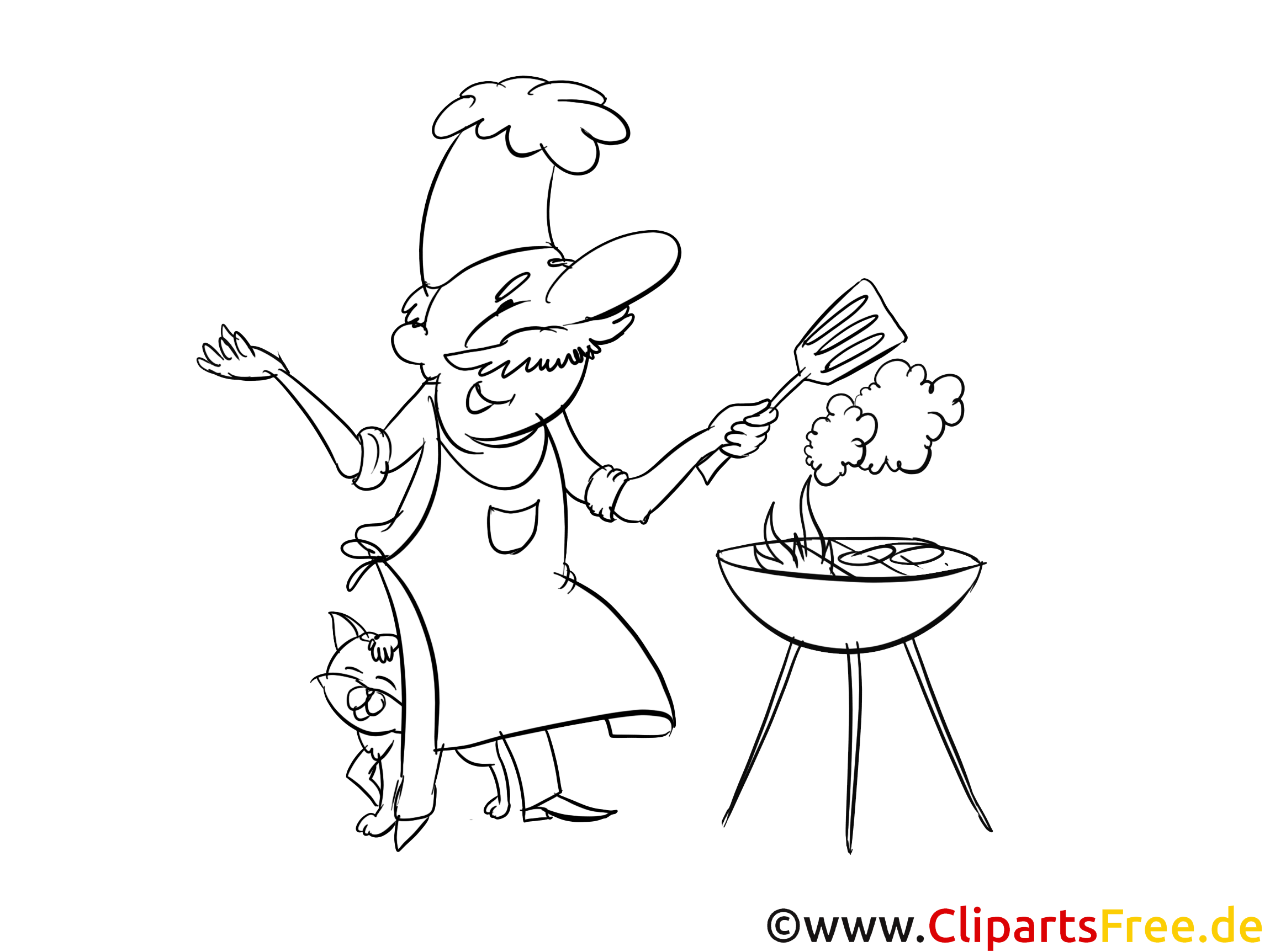Hier sehen wir einen fröhlichen Koch, der gerade dabei ist, etwas Leckeres zu grillen. Er trägt eine schicke Kochmütze, die fast so groß ist wie sein Kopf – echt witzig, oder? Der Koch hat einen liebevollen Gesichtsausdruck, als würde er seine Grill-Fähigkeiten zur Schau stellen. An seiner Seite steht ein süßes Kätzchen, das neugierig schaut, was da wohl auf dem Grill vor sich geht. Vielleicht hofft es auf ein leckeres Stückchen?
