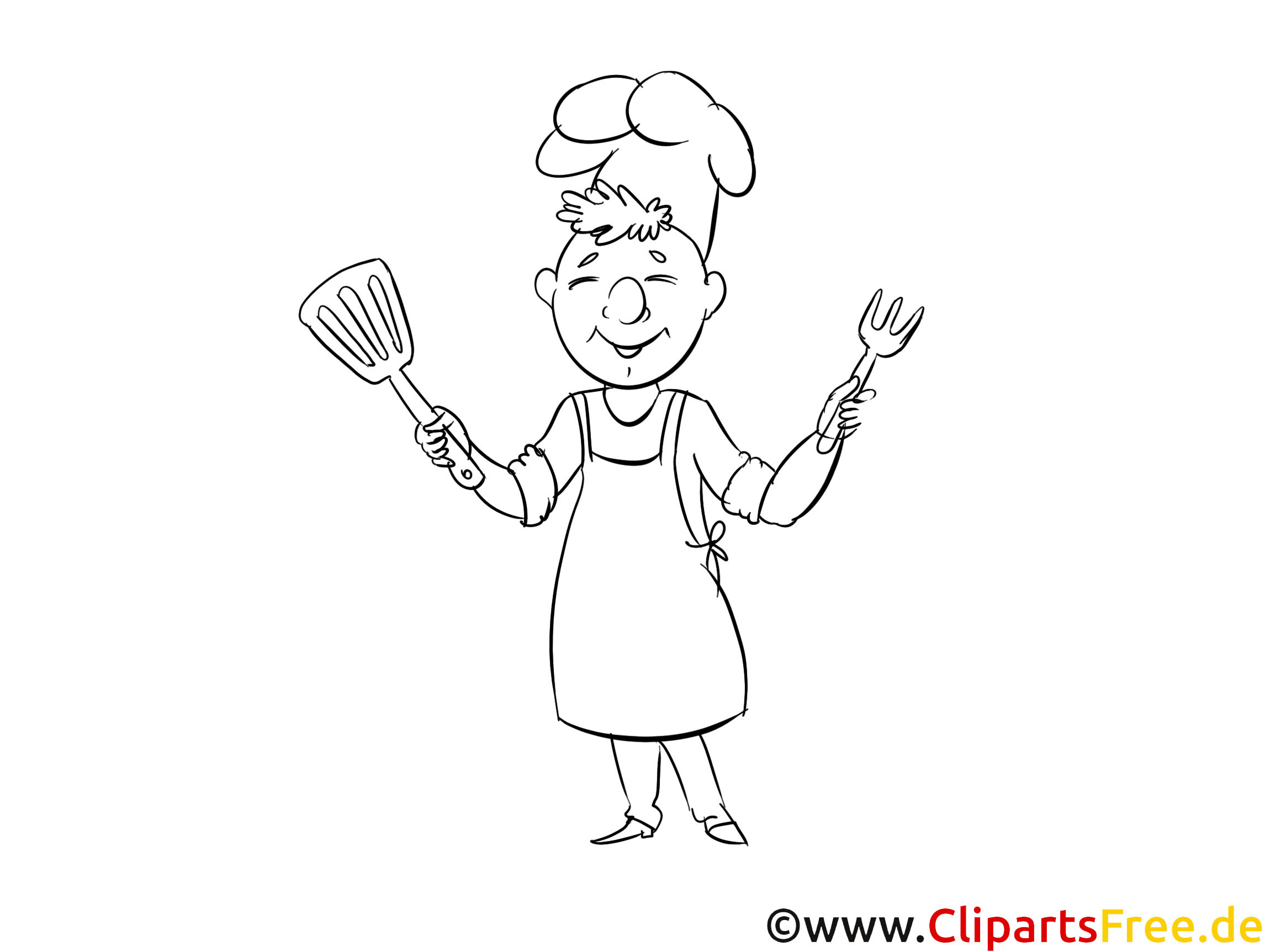 Hier haben wir ein fröhliches Bild eines Kochs, der offensichtlich ganz viel Lust hat, in der Küche kreativ zu sein. Er trägt eine große Kochmütze – die ist so rund und fluffig, fast wie ein kleines Kissen. In jeder Hand hält er einen wichtigen Küchenhelfer: in der einen eine Wender und in der anderen eine Gabel. Man sieht richtig, wie er strahlt, als ob er gerade das leckerste Gericht zaubern möchte! Die Schürze ist schlicht, aber das ist eben typisch für einen professionellen Koch. Es gibt keinerlei Schnickschnack, nur pure Freude am Kochen.