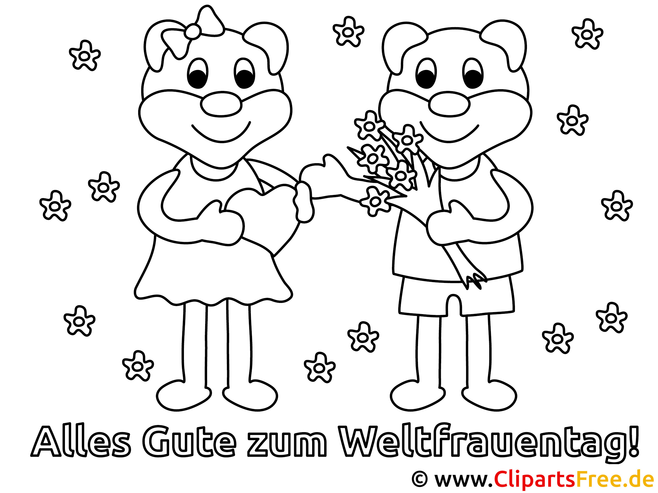In diesem fröhlichen Malbild siehst du zwei niedliche Bären. Die einen Bären, das Mädchen, hält ein Herz in ihren Pfoten, und der andere Bär, der Junge, trägt einen wunderschön gebundenen Blumenstrauß. Über ihnen, ganz zauberhaft, schweben kleine Blumen und es gibt diese klaren, lustigen Umrisse, die die Szene richtig lebendig machen. Auch der Spruch „Alles Gute zum Weltfrauentag!“ ragt freundlich aus dem Bild hervor und lädt zum Ausmalen ein. Das Bild ist eine wunderbare Vorlage, die ganz bestimmt gute Laune bringt!