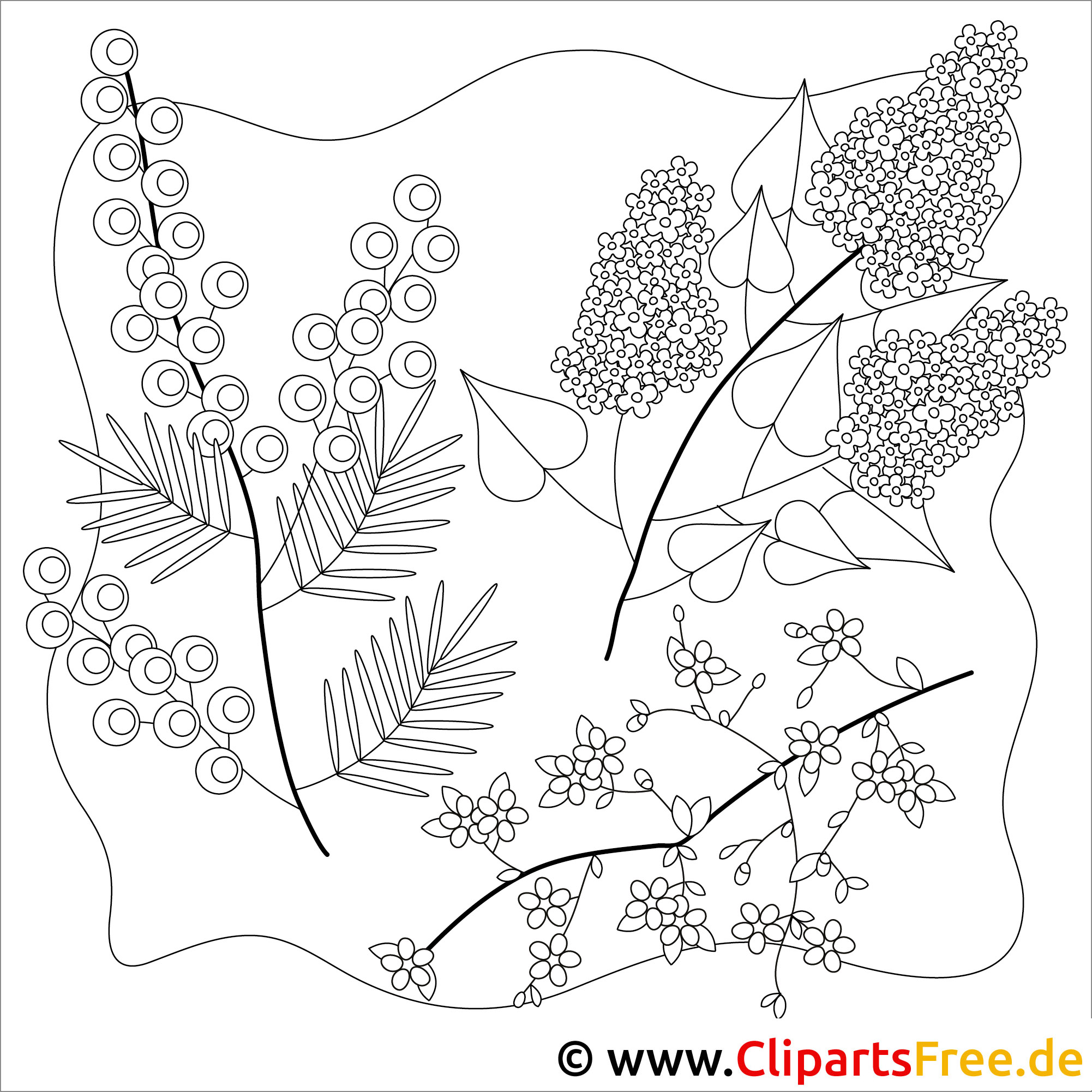 Hier sehen wir eine wundervolle Malvorlage mit verschiedenen Pflanzen und Blumen. Es gibt große, prächtige Blütenstände, die in den unterschiedlichsten Formen angeordnet sind. Die kleinen, feinen Blätter und die knalligen Beeren bringen zusätzlich Leben in das Bild. Man spürt förmlich die Frische des Frühlings und den Duft von blühenden Gärten. sozusagen, Ehrlich gesagt, ist es eine süße Komposition, die große und kleine Künstler gleichermaßen anspricht. weißt du, Schon fast nostalgisch, denkt man an Frühlingsspaziergänge. Einfach schön!