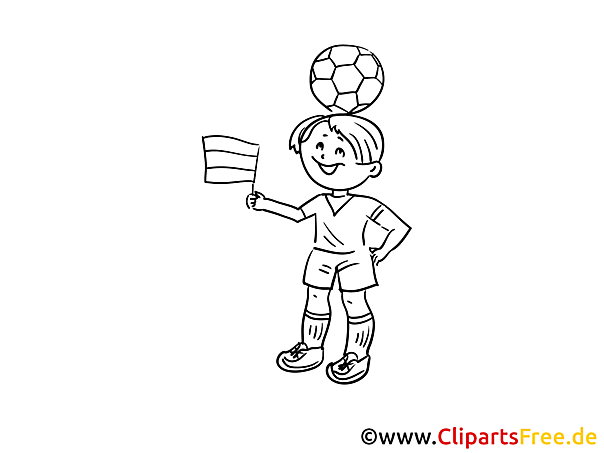 Die Malvorlage zeigt einen fröhlichen Jungen, der in einem sportlichen Outfit gekleidet ist. Er hat einen Fußball auf dem Kopf balanciert – eine witzige Pose, die sofort gute Laune verbreitet! In der einen Hand hält er eine kleine Flagge und winkt damit begeistert. Das Bild strahlt pure Lebensfreude aus: Der Junge lächelt und steht mit breiter Brust da, als ob er bereit wäre, ein großes Turnier zu gewinnen. Diese Vorlage ist ideal, um Kinder zum Ausmalen und Entdecken ihrer Kreativität zu inspirieren.