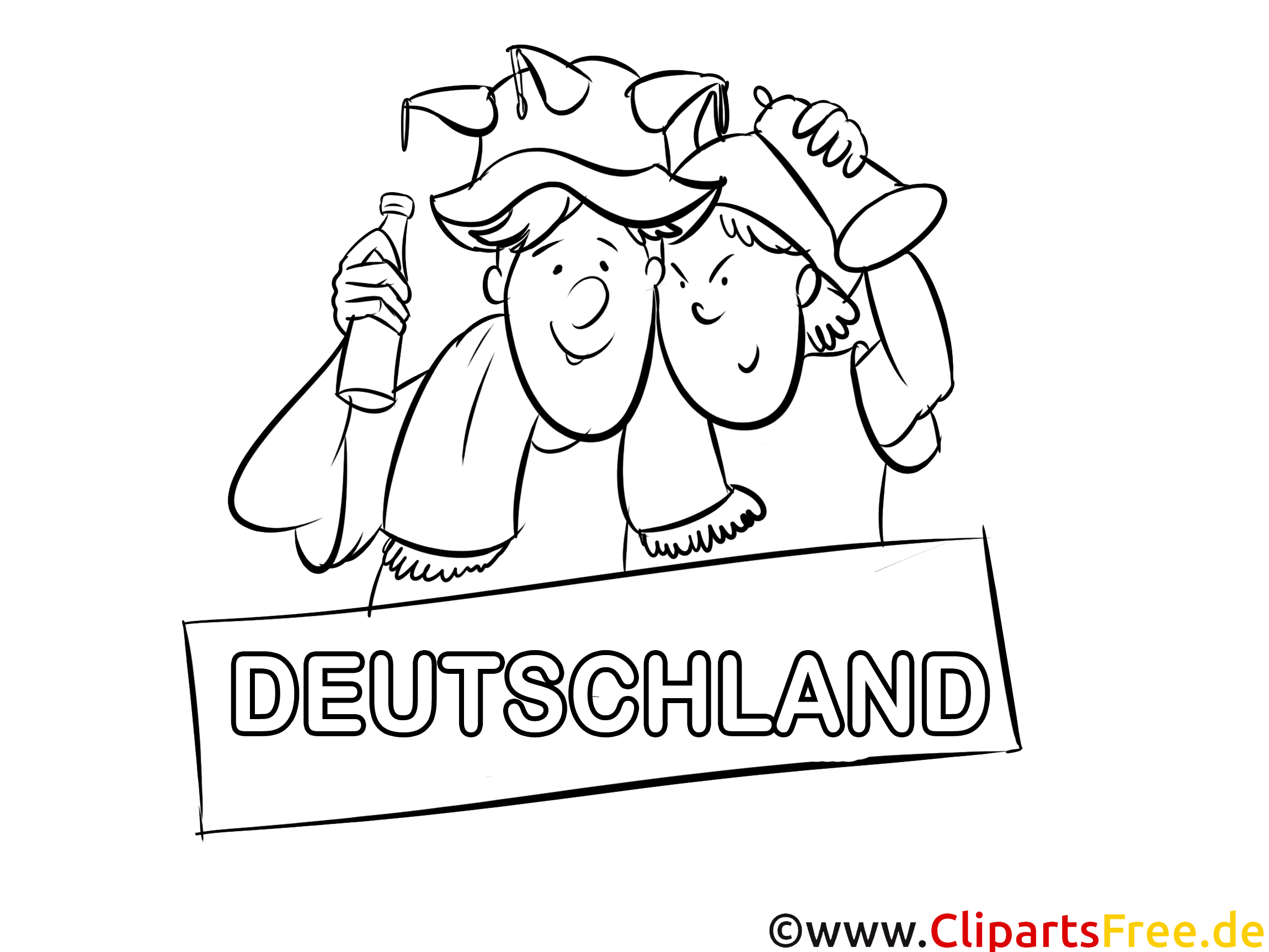 Das Ausmalbild zeigt zwei fröhliche Personen, die mit viel Spaß zusammenstehen. Sie haben lustige Hüte auf, so richtige Partyhüte, und scheinen zu feiern! In der einen Hand hält einer eine Flasche und in der anderen hat der andere ein großes Glas. Sie strahlen Freude und Freundschaft aus. Im Hintergrund steht der Schriftzug „DEUTSCHLAND“, was dem Bild einen besonderen Bezug gibt. sozusagen, Es macht sofort gute Laune, wenn man es ansieht, oder? Die Charaktere sind einfach gehalten, sodass sie ideal zum Ausmalen sind.