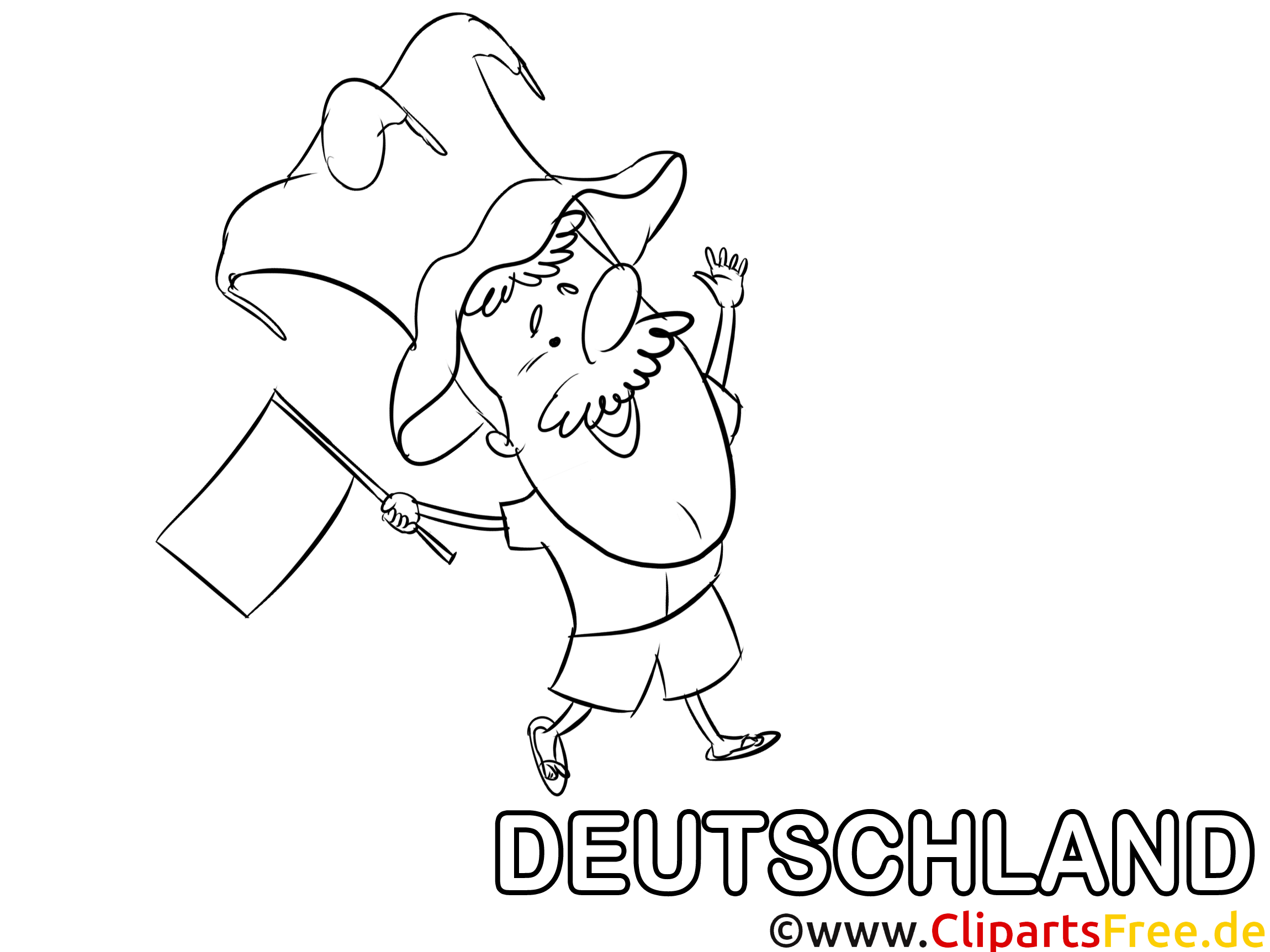 Schau dir mal dieses tolle Ausmalbild an! Es zeigt einen fröhlichen, kleinen Mann mit einem Hut und einer Fahne – ganz begeistert und voller Energie. Er strahlt richtig und scheint, als würde er etwas ganz Besonderes feiern! Am unteren Rand steht groß das Wort "DEUTSCHLAND", was das Bild besonders gut zur Geltung bringt. Einfach ideal, um beim Malen ein bisschen über Deutschland nachzudenken oder vielleicht auch etwas Neues über die Kultur zu lernen. Es ist wirklich ein Bild, das sowohl Kinder als auch Erwachsene anspricht und zum Ausmalen einlädt.