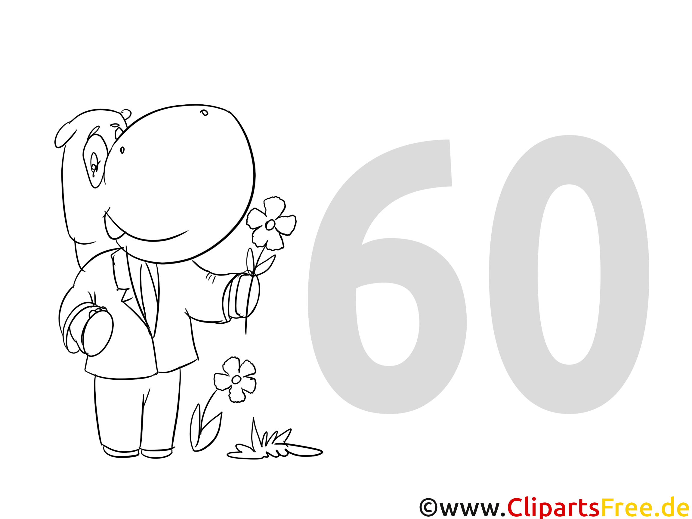 Oh, schau mal an! Auf diesem Ausmalbild steht ein niedliches Tier, das ein feines Jackett trägt und eine Blume in der Hand hält. Es scheint ganz fröhlich zu sein, fast so, als wolle es jemandem eine Freude machen. Die große, runde Schnauze – einfach putzig! Neben dem Tier sieht man die Zahl 60, die wirkt wie eine Aufforderung, das Bild besonders zu gestalten. Die Blumen und das kleine Gras am Boden geben dem Bild noch mehr Lebendigkeit. Ehrlich gesagt, wer könnte da widerstehen, seine Farben auszupacken?