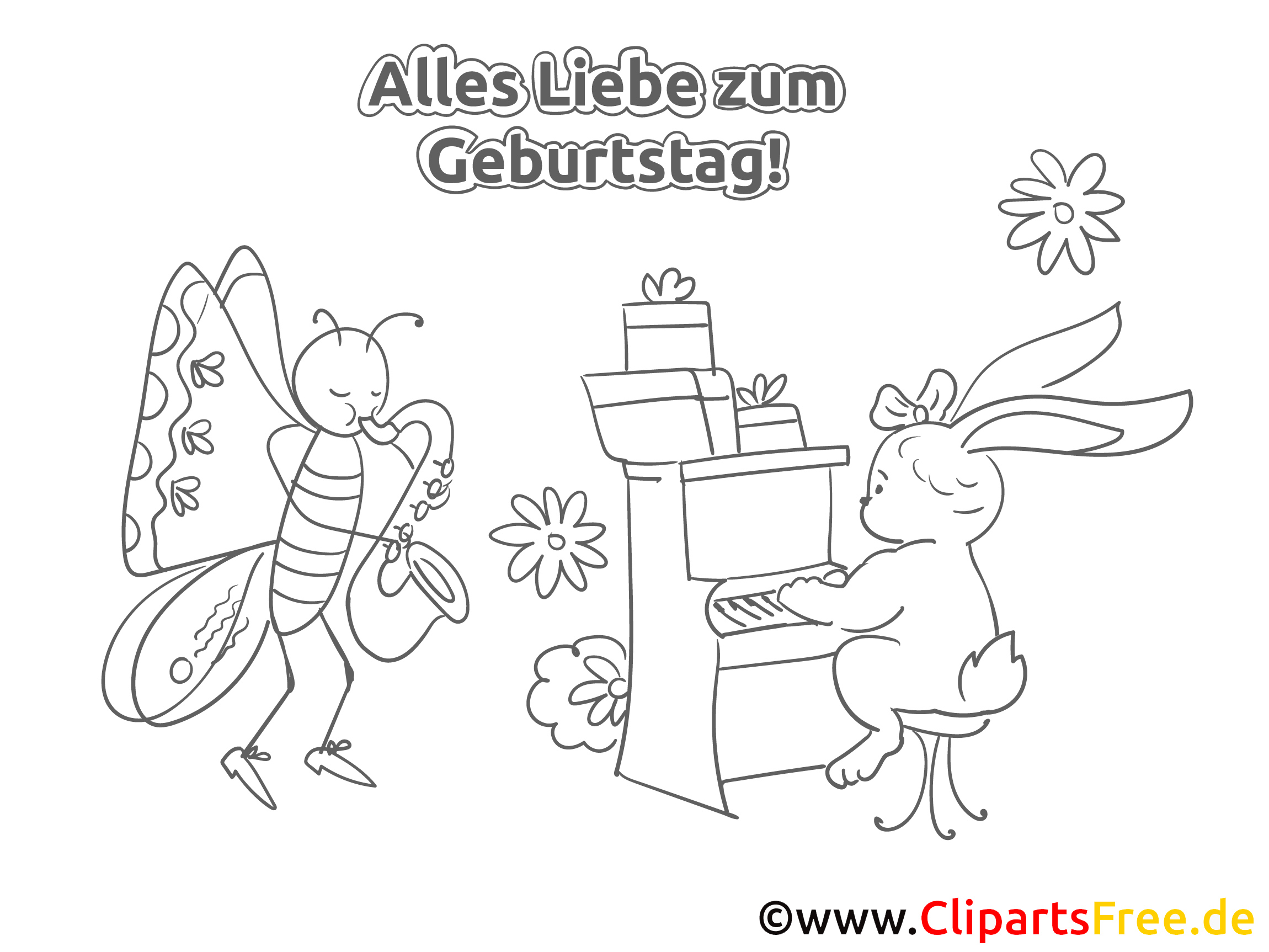 Das Ausmalbild zeigt eine fröhliche Szene, die einfach perfekt für Geburtstagsfeiern ist. Hier sehen wir einen kleinen Hasen, der begeistert an einem Klavier spielt. Ja, genau! Und daneben sitzt ein bunter Schmetterling mit einem Saxophon in der Hand. Daszzweiutiklachende Musizierende vermitteln wahre Freude und Lebensfreude. Um sie herum blühen hübsche Blumen, und über allem schwebt der text „Alles Liebe zum Geburtstag!“. Ein Bild, das nicht nur gut aussieht, sondern auch gute Laune verbreitet!