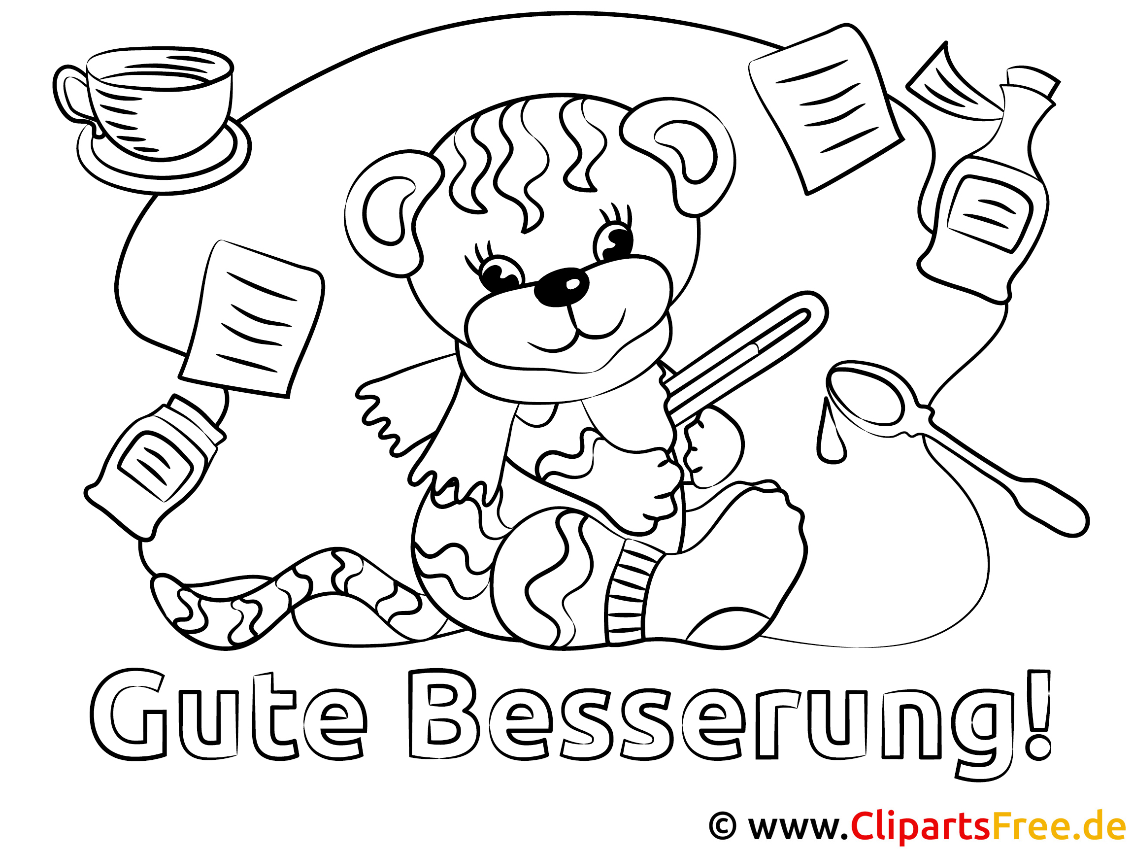 Dieses süße Ausmalbild zeigt einen knuffigen kleinen Bären, der sich in einer gemütlichen Umgebung ausruht. Um ihn herum sind verschiedene Dinge platziert, die ganz viel Wärme und Fürsorge ausstrahlen. Zum Beispiel sehen wir eine dampfende Tasse, vielleicht heißer Kakao oder Tee, und einige Medizinfläschchen. Das Bild vermittelt ein Gefühl von Geborgenheit und Heilung. hm, Der Bär trägt einen bunten Schal und hat sich wohl so richtig eingekuschelt. „Gute Besserung!“ ruft er uns zu, was besonders im Freundes- oder Familienkreis für Freude sorgt.