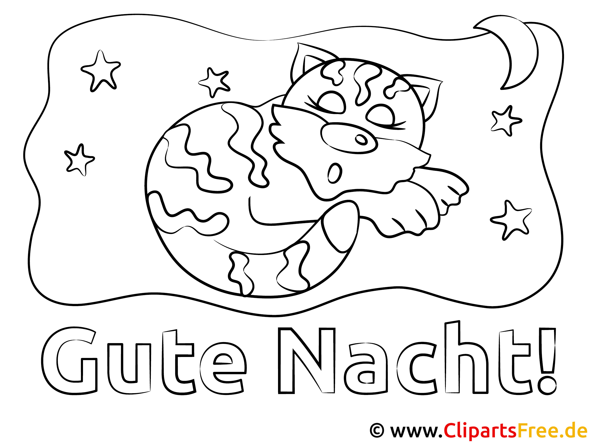Das Bild zeigt eine süße, schnurrende Katze, die friedlich schläft. Ihr Fell ist gestreift, und die kleinen, geschlossenen Augen spiegeln Ruhe und Geborgenheit wider. Um sie herum funkeln einige Sterne, die die nächtliche Atmosphäre wunderbar einfangen. Darüber steht in großen, gut lesbaren Buchstaben „Gute Nacht!“. naja, Man denkt sofort an eine entspannte Abendstimmung – eine Einladung zum Träumen, um den Tag hinter sich zu lassen. Diese Malvorlage ist einfach zum Ausmalen, aber auch so ansprechend, dass man sie auch ohne Farbe mag.