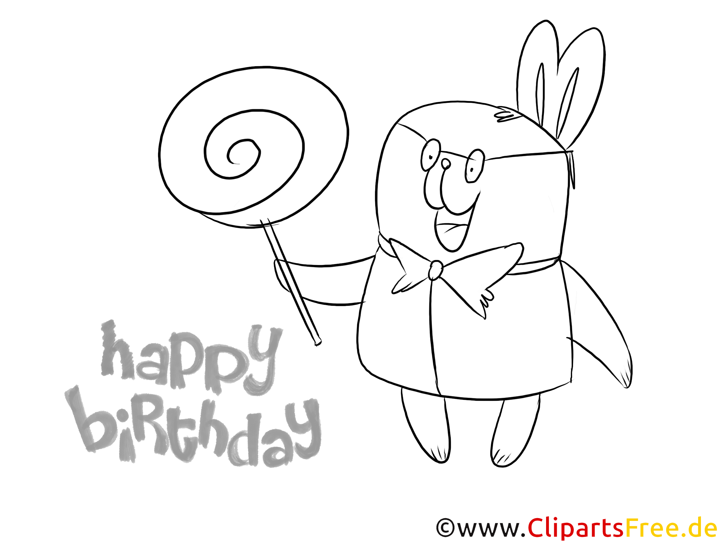Stell dir vor, da ist ein fröhlicher kleiner Charakter, der einer riesigen Geburtstagsparty gleichsam lächelnd, als auch gebannt entgegenschaut. Er trägt eine große Schleife um den Hals, was ihm einen ziemlich besonderen Look verleiht. In einer Hand hält er einen großen, spiralförmigen Lolli. Das dazugehörige “Happy Birthday” in einer verspielten Schriftart macht alles noch festlicher. Ehrlich gesagt, es lädt einfach zum Ausmalen ein, oder? Ein Bild, das die Vorfreude auf den Geburtstag perfekt einfängt – ideal, um es zum Leben zu erwecken.