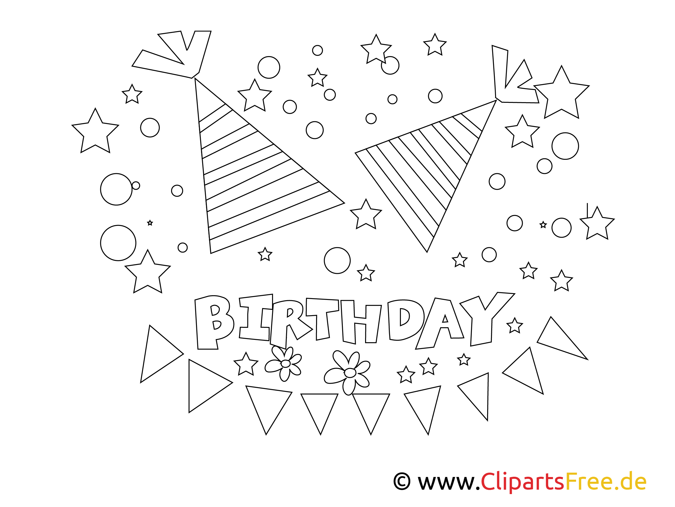 Das Ausmalbild zeigt eine fröhliche Geburtstagsfeier. Zwei hübsche, geschnittene Partyhütchen, die leicht schräg stehen, ziehen sofort die Blicke auf sich. Um sie herum tanzen viele verschiedene Formen – Sterne, Luftballons und kleine Punkte. Das Wort "BIRTHDAY" prangt in einer verspielten Schriftart in der Mitte, umrahmt von Blumendetails und bunten Wimpeln. irgendwie, Dieses Bild zum Ausmalen vermittelt eine wunderbare Feierlaune.