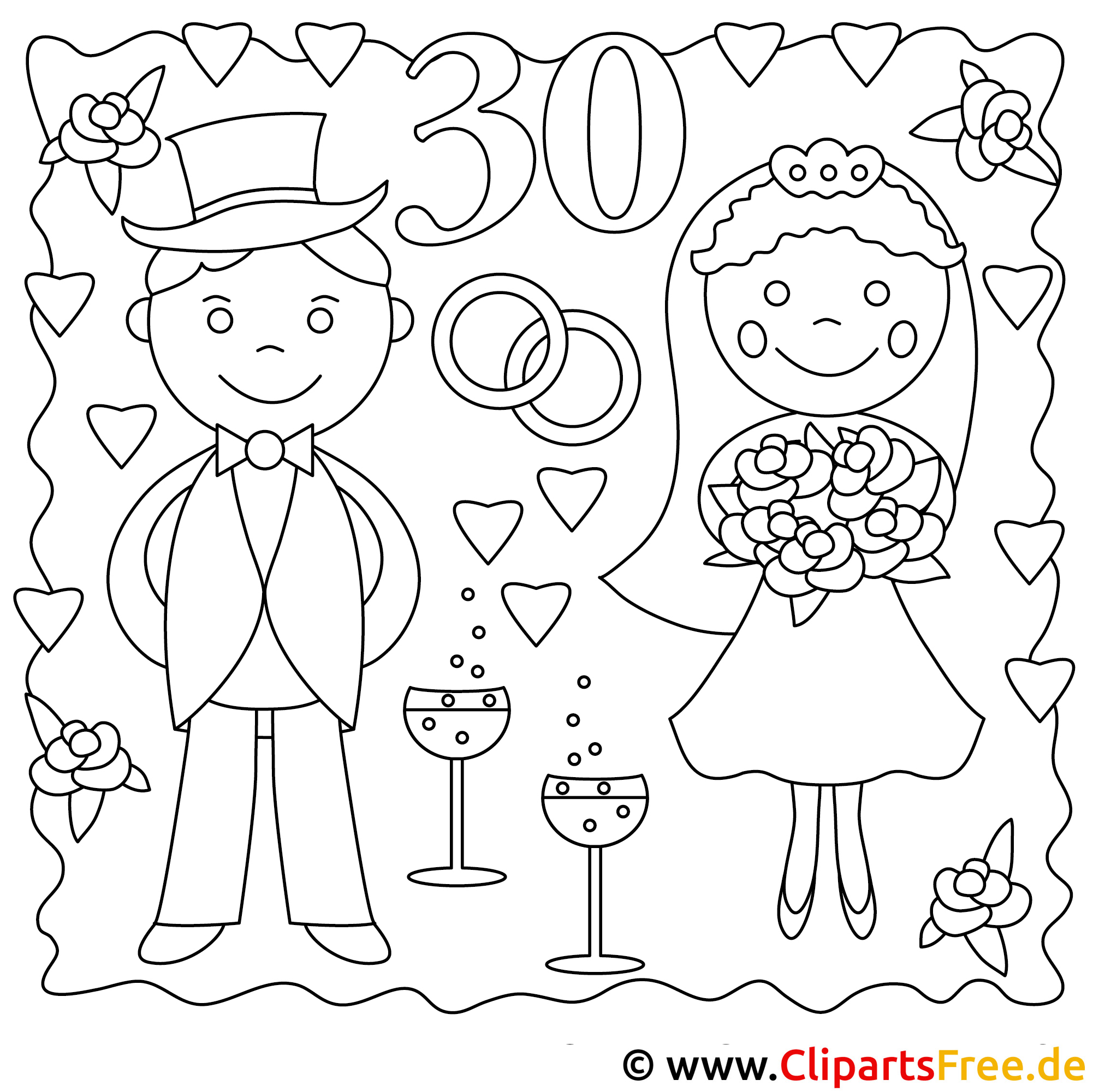 Hier haben wir ein fröhliches Ausmalbild, das besonders Freude und Feiern ausstrahlt. Zwei fröhliche Figuren, ein Brautpaar, stehen im Mittelpunkt: Der Bräutigam mit einem eleganten Zylinder und der bezaubernden Braut mit einem wunderschönen Strauß aus Blumen in der Hand. Umgeben von süßen Herzen und ein paar niedlichen Hochzeitsringen, hat das Bild noch die Zahl „30“ – vielleicht ein Hinweis auf ein tolles Jubiläum. Macht richtig Lust, zum Stift zu greifen, oder?