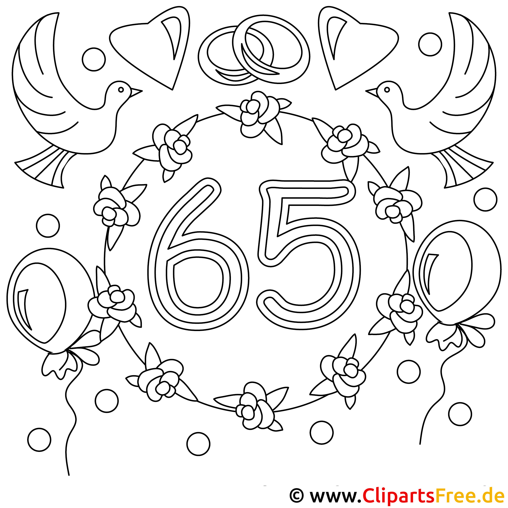 Das Ausmalbild zeigt einen fröhlichen und festlichen Rahmen, perfekt für besondere Anlässe. In der Mitte steht die Zahl „65“, umgeben von eleganten Ringen, die symbolisch für die ewige Liebe stehen. Zwei verspielte, schwangere Tauben fliegen durch das Bild und erscheinen einladend und wunderbar. Um die Zahl herum blühen zarte Rosen, was dem Gesamtbild einen romantischen Flair verleiht. Schließlich ergänzen ein paar Ballons und kleine Herzen das Motiv – ideal für Geburtstagsfeiern oder Jubiläen.