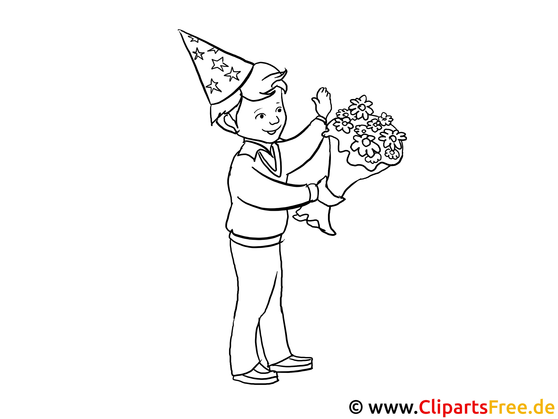 Hier haben wir ein fröhliches Bild eines Jungen, der einen bunten Strauß Blumen in den Händen hält. Er trägt einen lustigen Hut, geschmückt mit leuchtenden Sternen – ein echter Partyhut! Man sieht richtig, wie glücklich er ist. Sein Lächeln strahlt Freude aus, das macht gute Laune. Die Blumen sind schön gezeichnet, mit vielen Details und gleichzeitig so einfach, dass man sie wunderbar ausmalen kann. Das Bild eignet sich echt toll für kreative Köpfe?!.