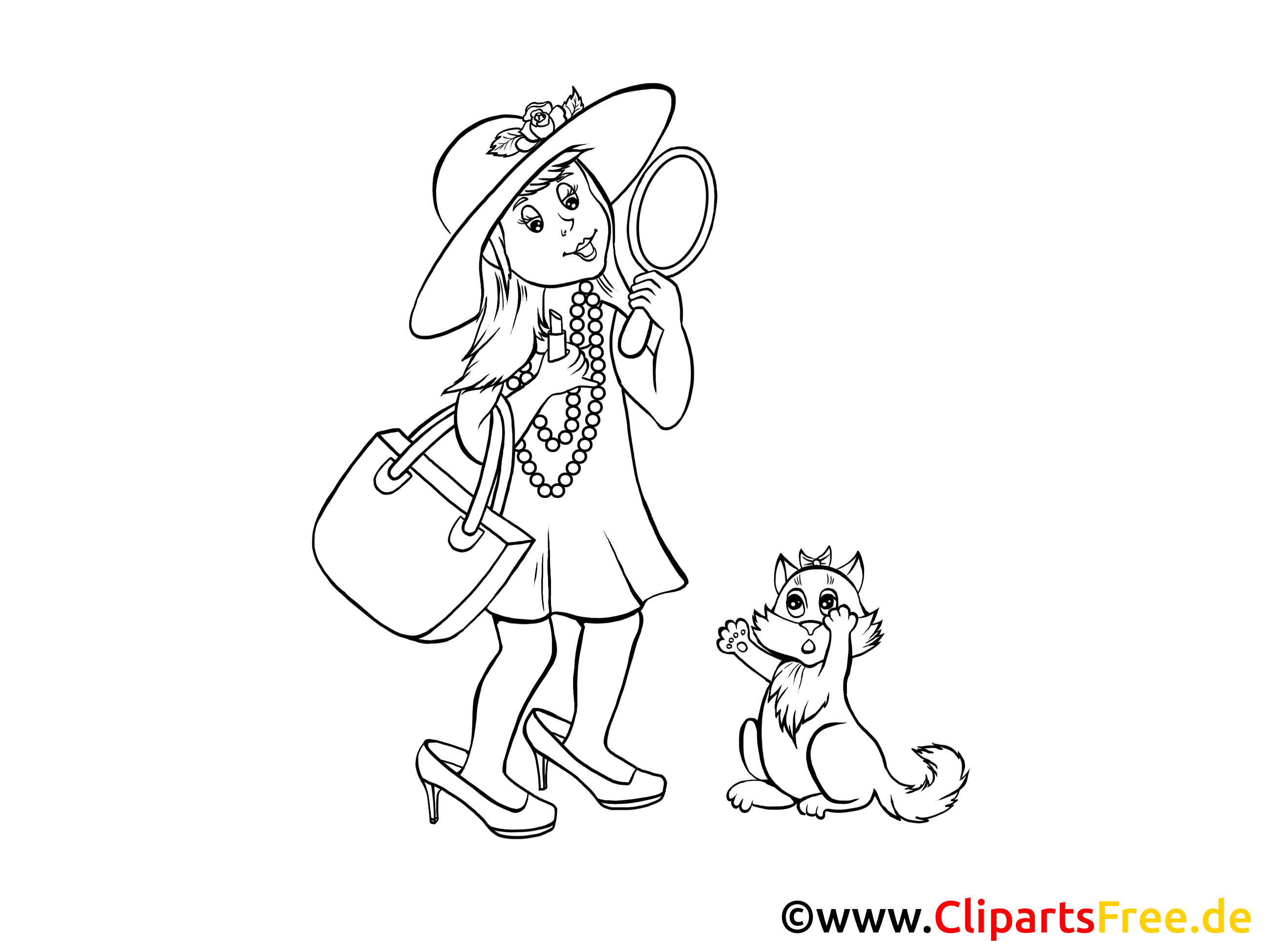 Kostenlose Malvorlage Mädchen mit Spiegel, Katze