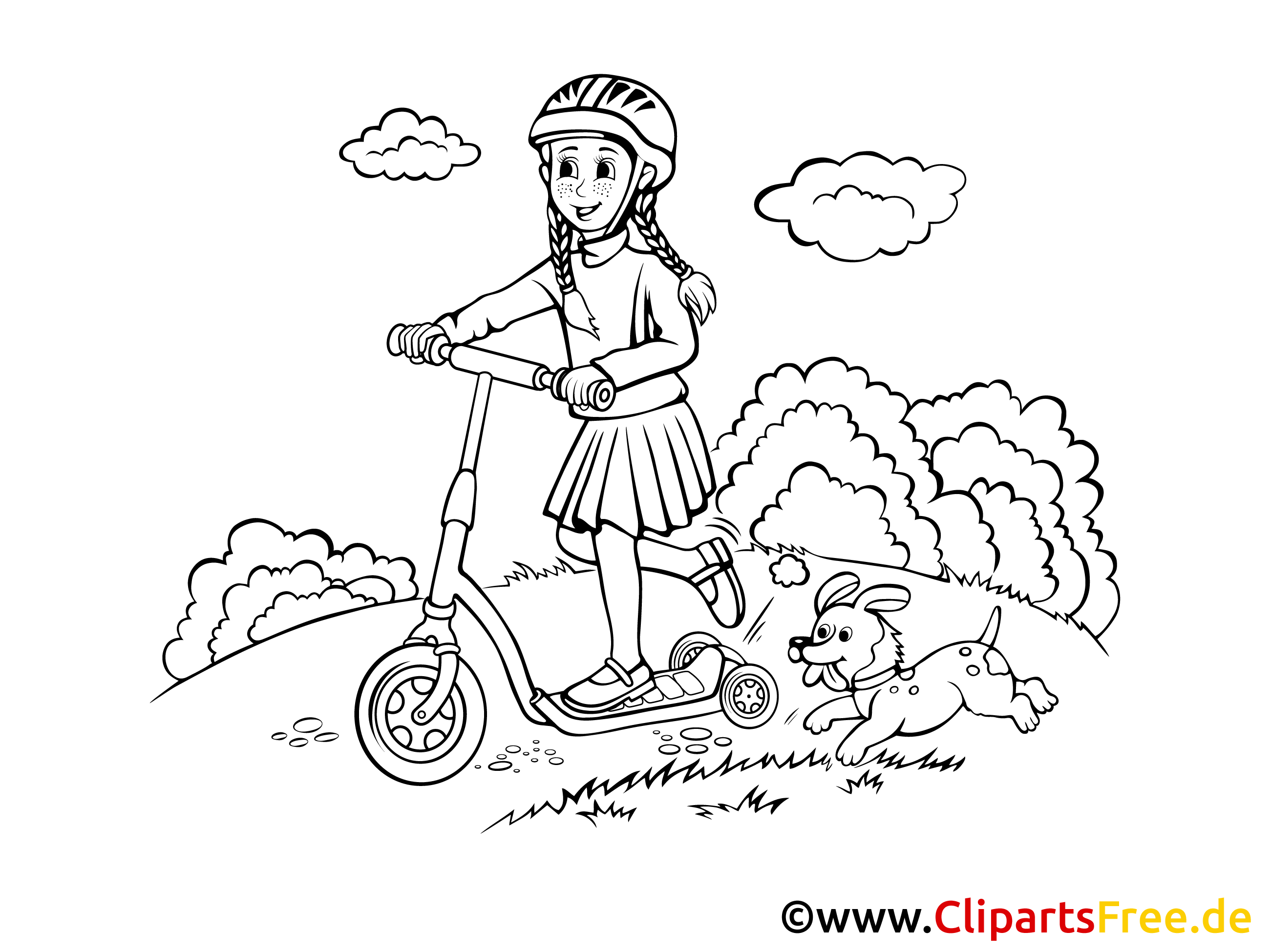 Original-Bild: Kostenlose Malvorlage Mädchen im Fahrradhelm auf Roller