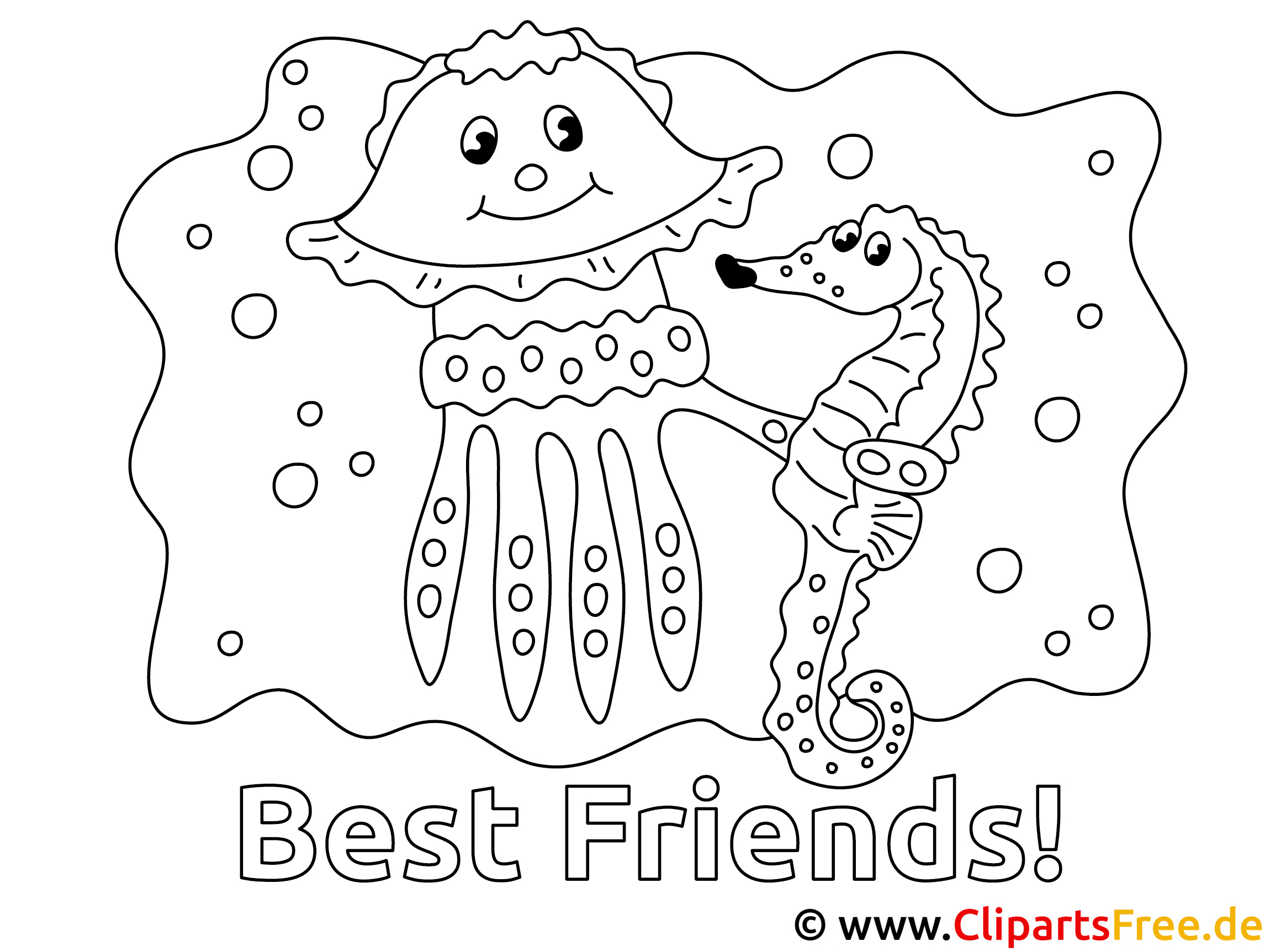 Das Ausmalbild zeigt zwei niedliche Meeresbewohner: eine farbenfrohe Qualle und ein träumerisches Seepferdchen. Die Qualle hat ein breites Grinsen, scheint richtig froh zu sein. Ihre langen Tentakeln sehen fast wie eine Art Wasserfall aus, der in die Tiefe fließt. Das Seepferdchen hingegen schaut neugierig und aufgeschlossen. Zwischen den beiden steht ein herzlicher Schriftzug, der „Best Friends!“ verkündet. Einfach süß, oder? Und ganz ehrlich, wer könnte bei so einem Bild nicht die Freude zu spüren? Es ist eine wahre Einladung, die eigene Kreativität herauszulassen und das Bild mit bunten Farben zu füllen.